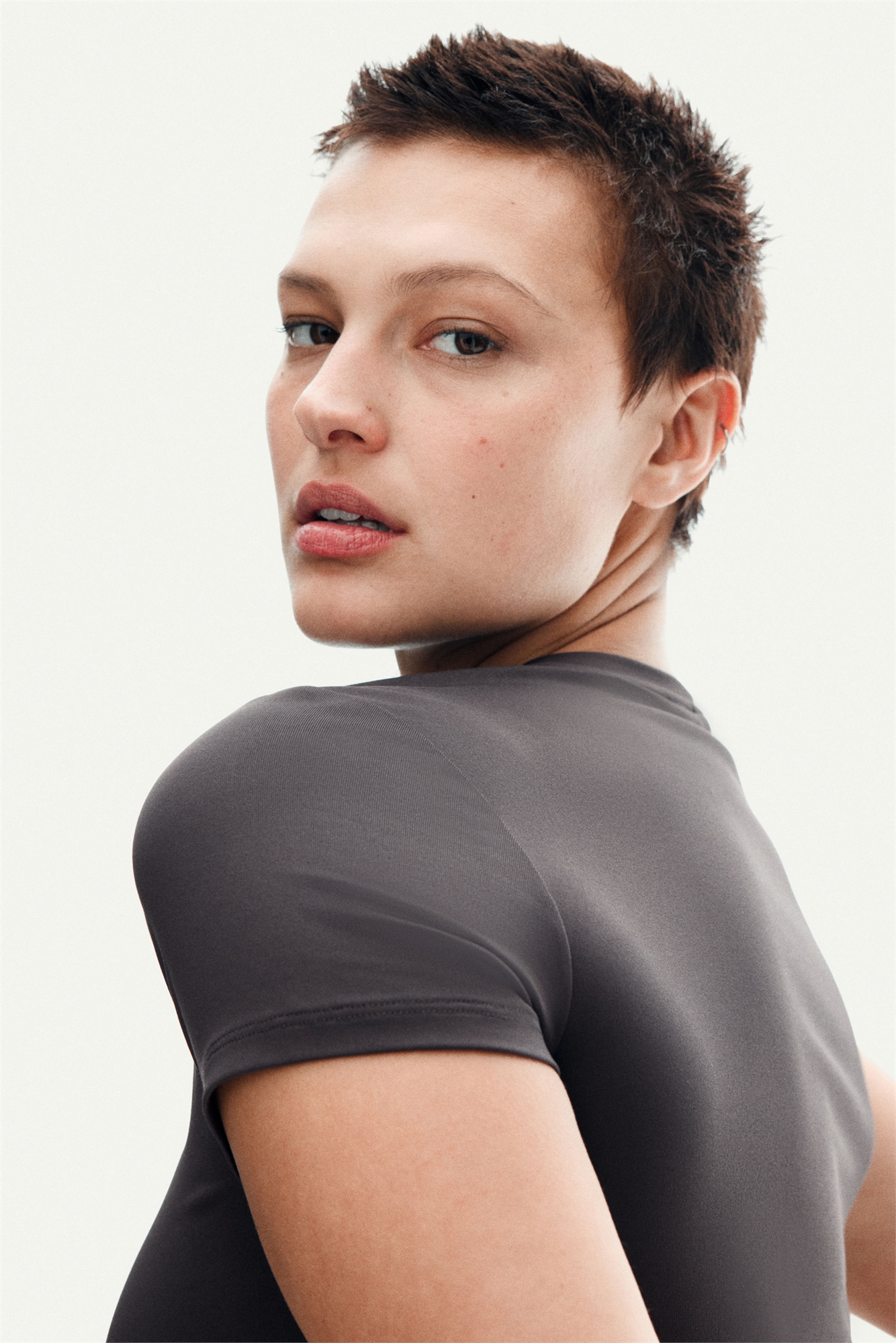 Обрезанная приталенная футболка из мягкой микрофибры с горловиной.