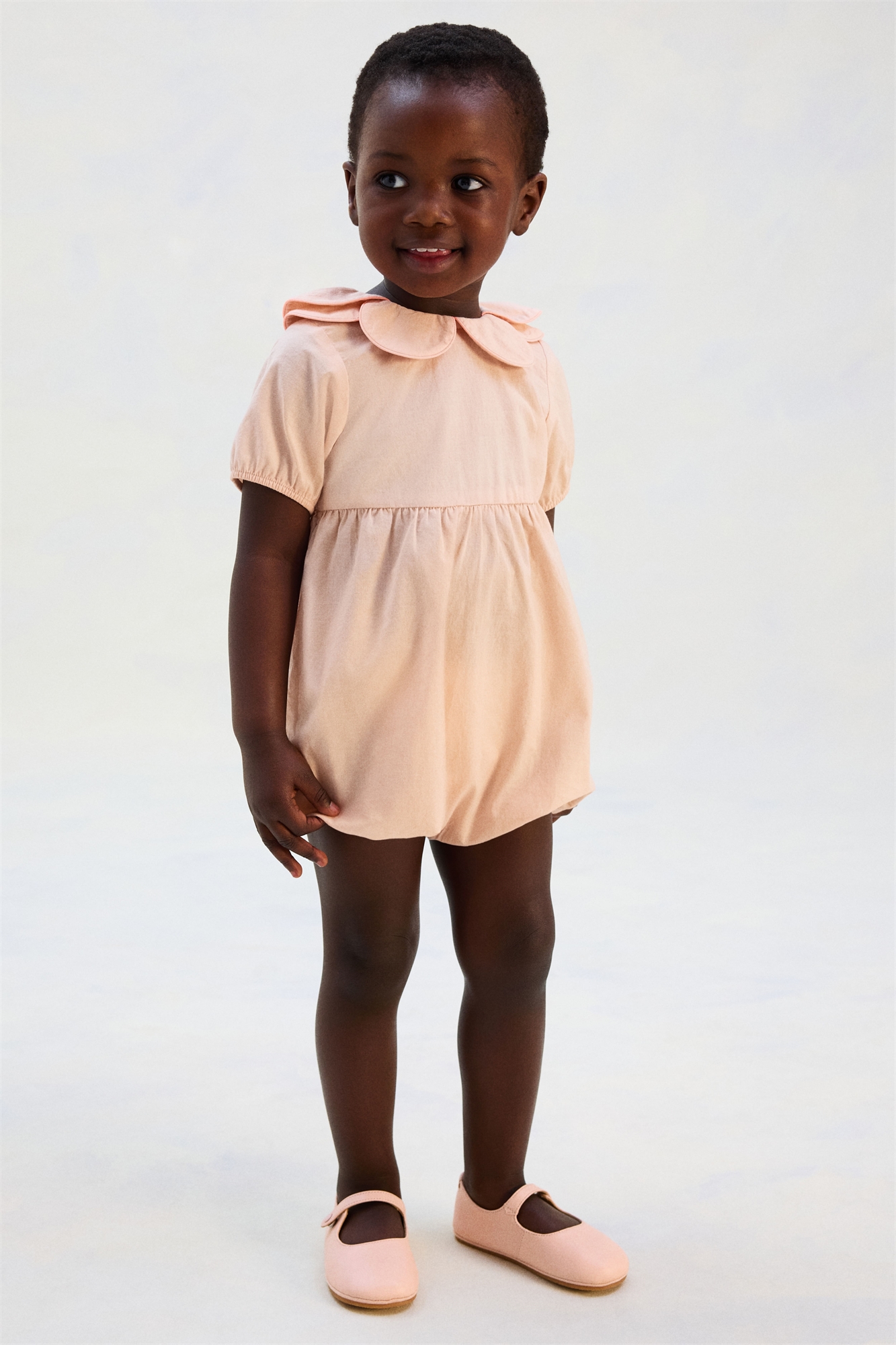 H&M Adorables. Ромпер с короткими рукавами из высококачественного хлопка мягкого плетения. Воротник "лепесток" с оверлоком, отделка акцентного цвета, застежка на пуговицы сзади и сборки на талии. Застежки внизу для удобства переодевания и мягкая узкая резинка на манжетах и вокруг ножек. Коллекция H&M Adorables - это подборка удобных и качественных вещей, не теряющих актуальности.