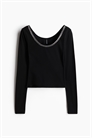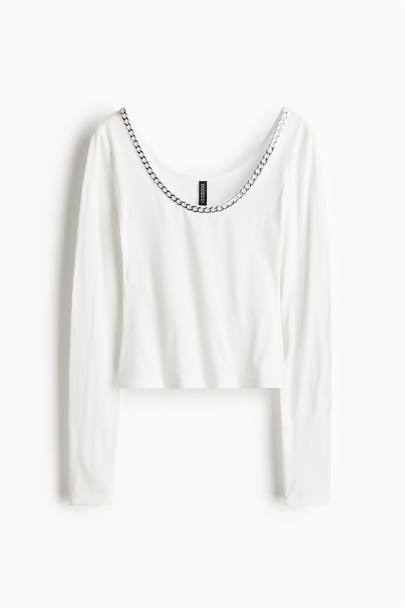 Короткий приталенный топ из мягкого трикотажа с длинными рукавами и глубоким круглым вырезом спереди и сзади. Декоративная деталь в виде цепочки по переднему краю выреза.