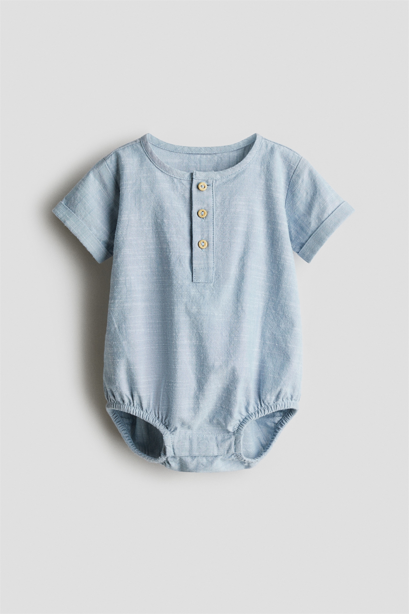 Ромпер из мягкого хлопкового полотна с круглым вырезом, застежкой на пуговицы и короткими рукавами с пришитыми оборочками на манжетах. Мягкая узкая резинка вокруг ножек и потайные кнопки внизу для удобства переодевания.