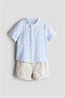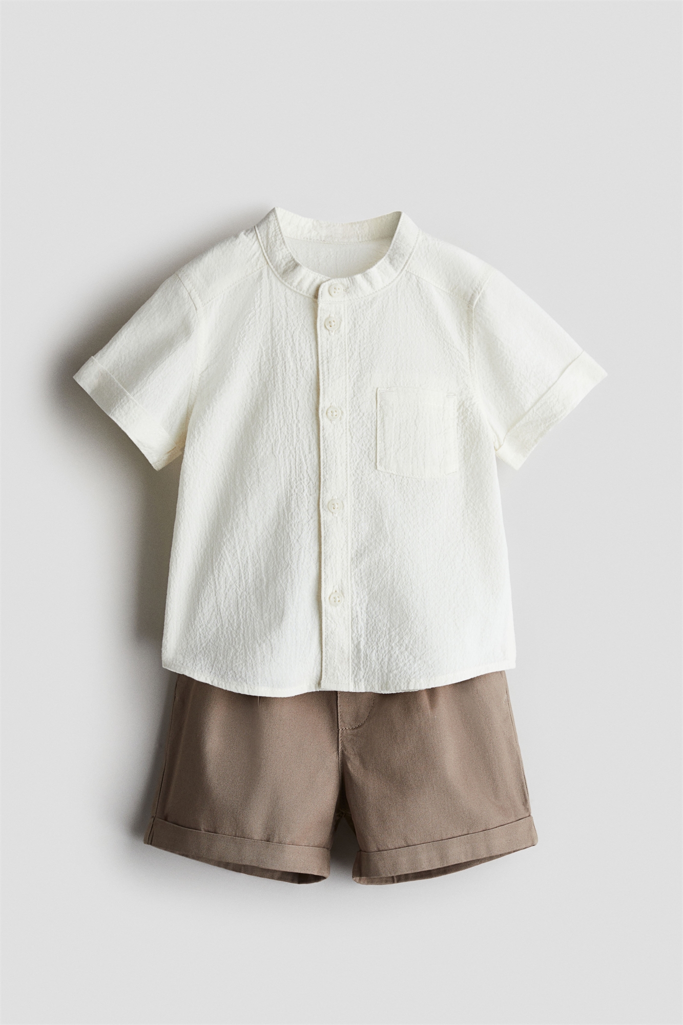 Хлопковый комплект из рубашки фактурного плетения и пары шорт из мягкой саржи. Рубашка с короткими рукавами, воротником-бантом, пуговицами спереди, открытым нагрудным карманом и пришитыми оборочками на манжетах. Шорты с регулируемой эластичной талией, фальшивой ширинкой с прижимной планкой, декоративными карманами спереди и сзади. Пришитые оборочки на манжетах.