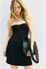 Короткое приталенное платье-труба из ребристого джерси с вырезом в форме сердца, скрытой резинкой в верхней части и складками godet на талии, создающими мягкую расклешенную юбку.