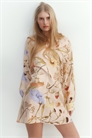 Короткое платье свободного покроя из тканого материала, изготовленного из смеси вискозы. Воротник-бант со складками по всему периметру и V-образной проймой спереди. Длинные рукава реглан с разрезом и пуговицей на манжетах и узкий съемный пояс-завязка на талии. Без подкладки.