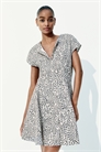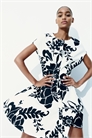 Короткое платье из воздушного хлопкового полотна с круглым вырезом, пуговицами спереди и рукавами-шапочками. Формирующие вытачки для зауженной талии и расклешенная юбка со вставками спереди и сзади для придания дополнительного объема. Без подкладки.