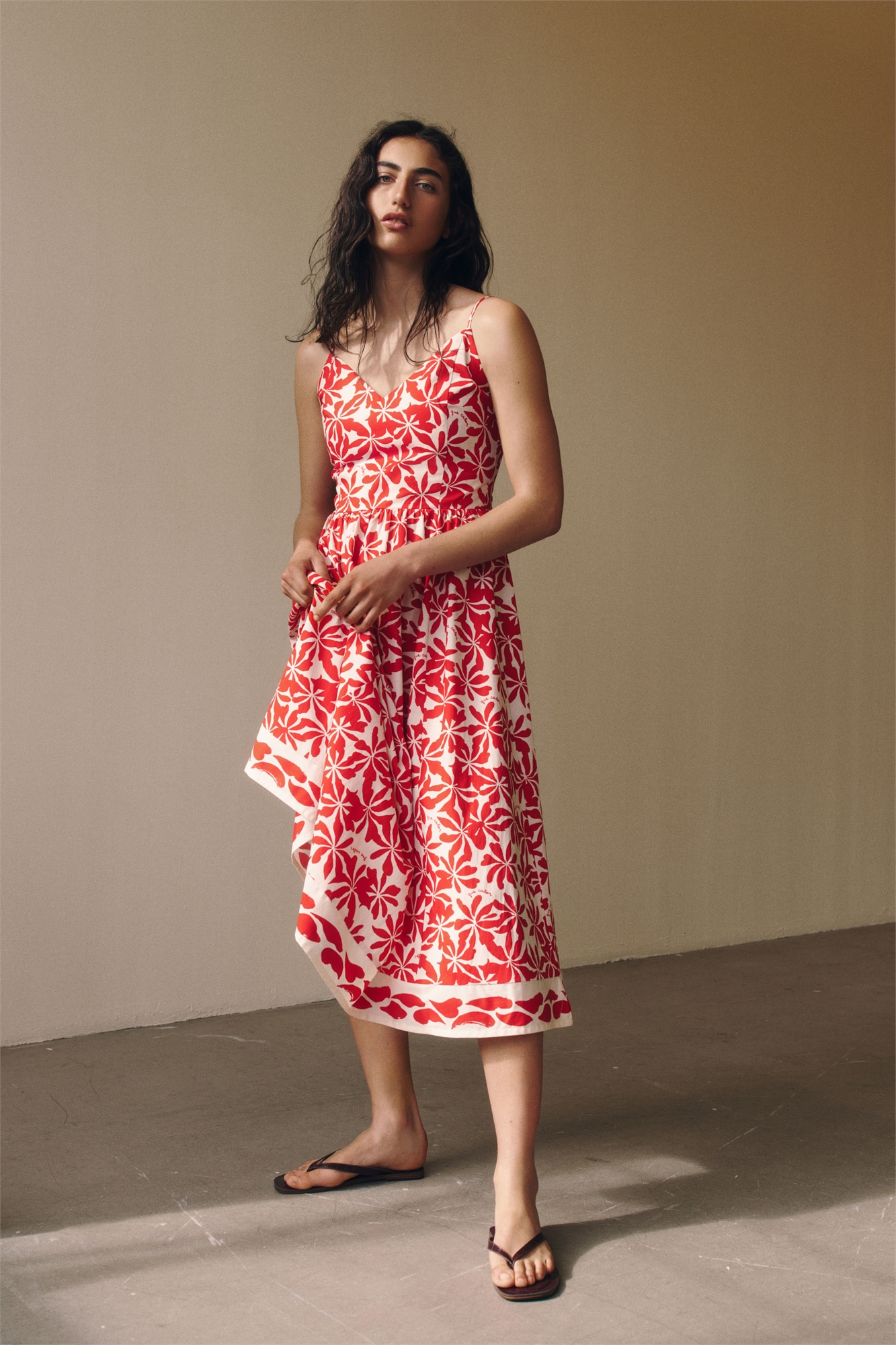 Платье длиной до колен из хлопкового полотна с регулируемыми бретелями-спагетти и приталенным лифом на подкладке с V-образным вырезом и отделкой сзади. Расклешенная юбка без подкладки.