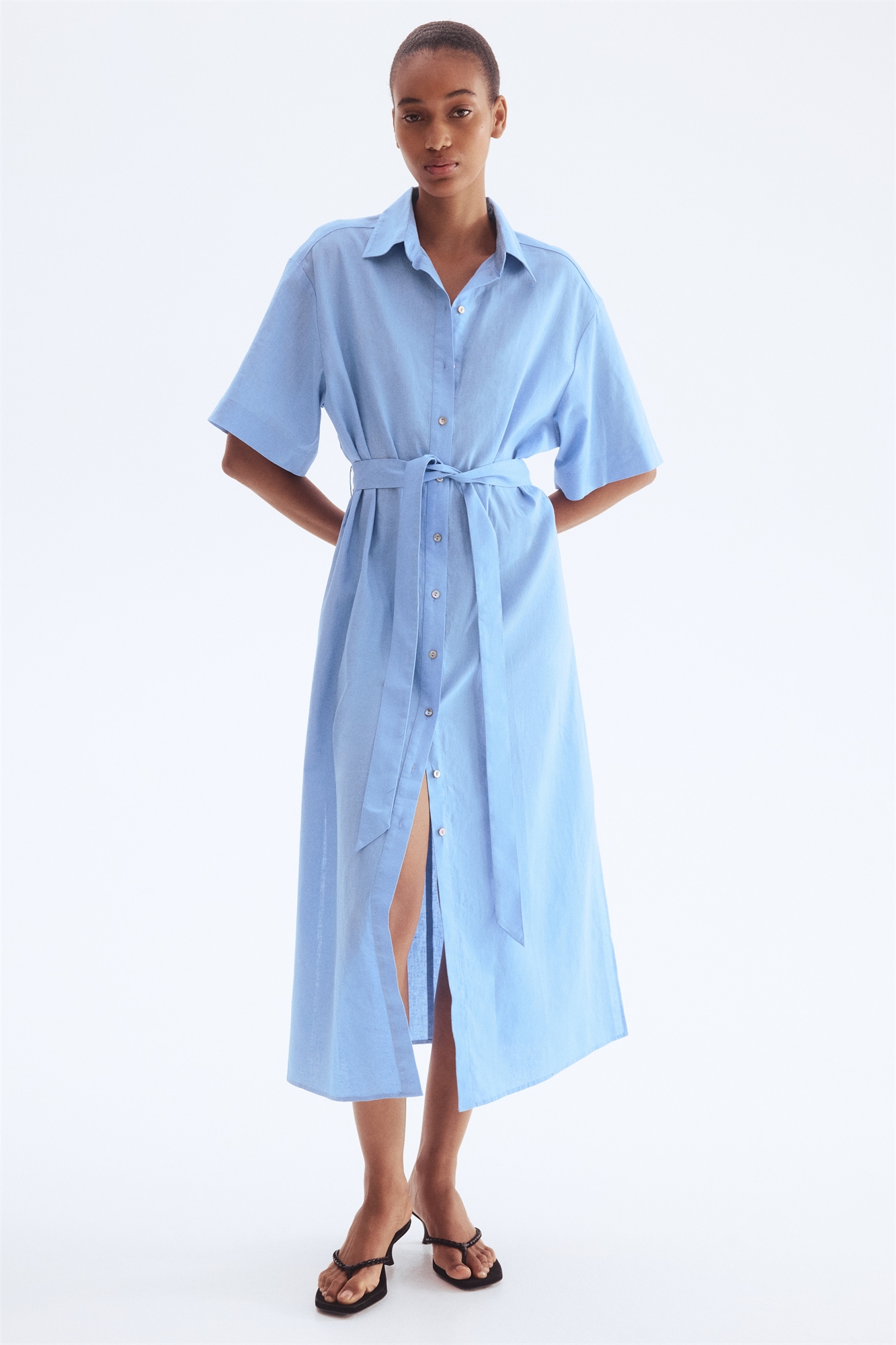 Платье-рубашка свободного покроя длиной до колен из воздушного льна и хлопка. Воротник, пуговицы спереди и съемный пояс-завязка на талии. Слегка спущенные плечи, рукава длиной до локтя и подол прямого кроя с разрезом с каждой стороны. Без отделки.