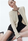 Кардиган из мягкого трикотажа пуантель с круглым вырезом, длинными рукавами и открытой передней частью с пуговицей в верхней части. Отделка пико контрастного цвета по вырезу горловины, пройме и манжетам спереди.