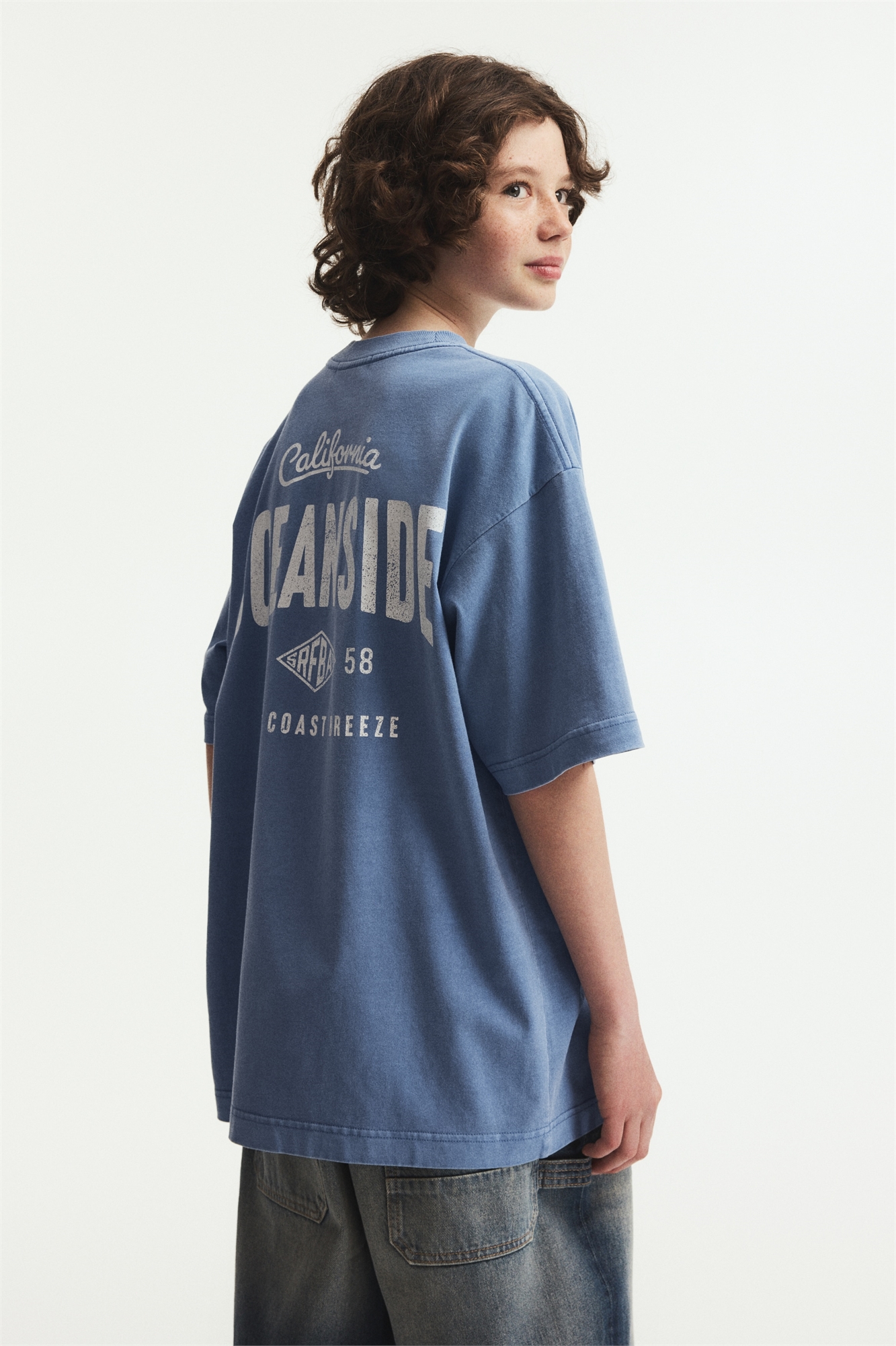 Свободная футболка из мягкого хлопкового джерси с набивным рисунком, круглым вырезом с ребристой отделкой и спущенными плечами.
