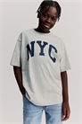 Свободная футболка из мягкого хлопкового джерси с набивным рисунком, круглым вырезом с ребристой отделкой и спущенными плечами.