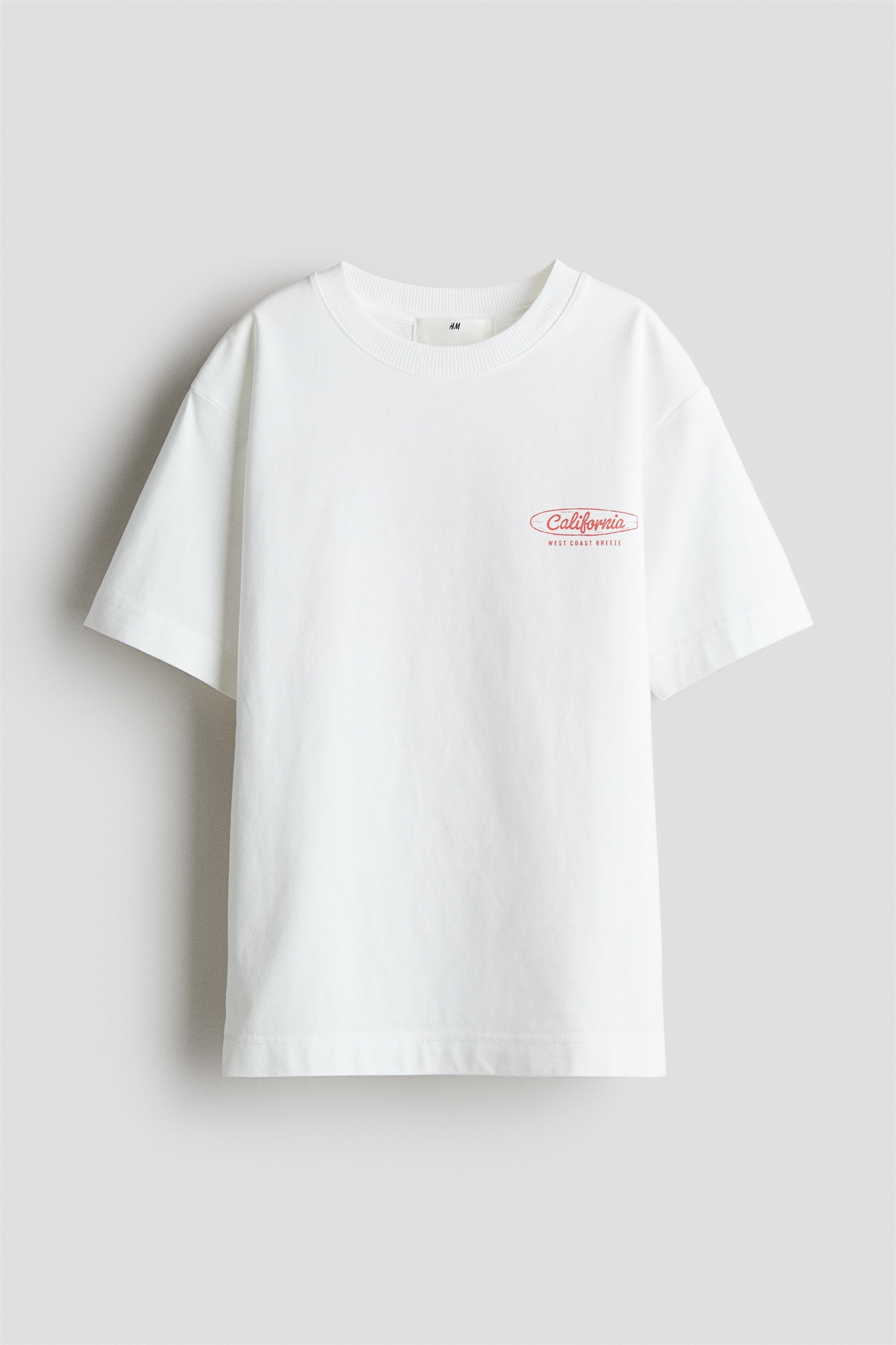 Свободная футболка из мягкого хлопкового джерси с набивным рисунком, круглым вырезом с ребристой отделкой и спущенными плечами.