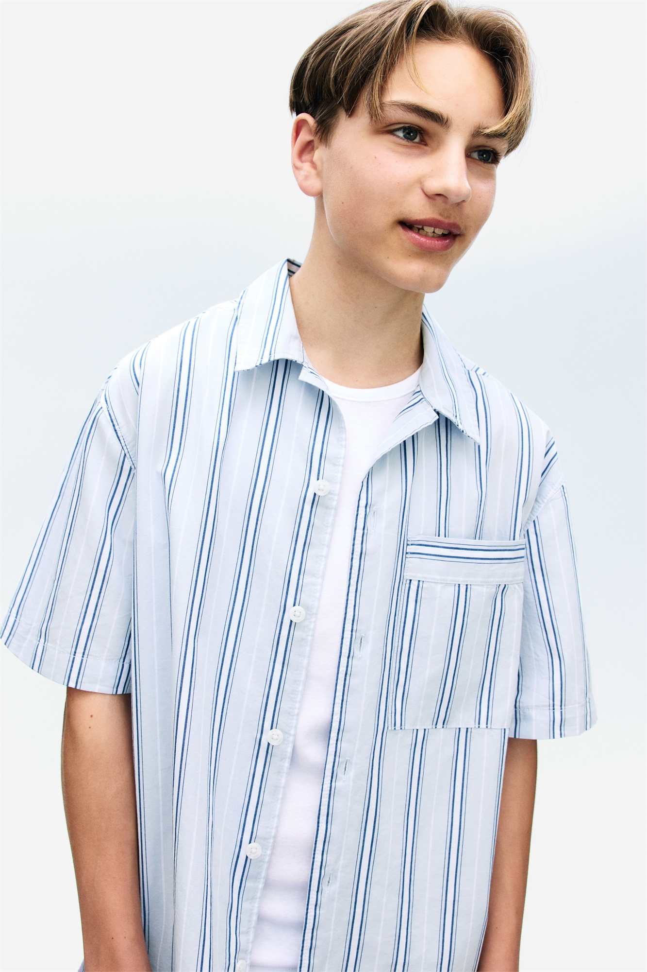 Свободная рубашка из хлопкового поплина с отложным воротником, пуговицами спереди и накладным нагрудным карманом. Слегка спущенные плечи и короткие рукава.
