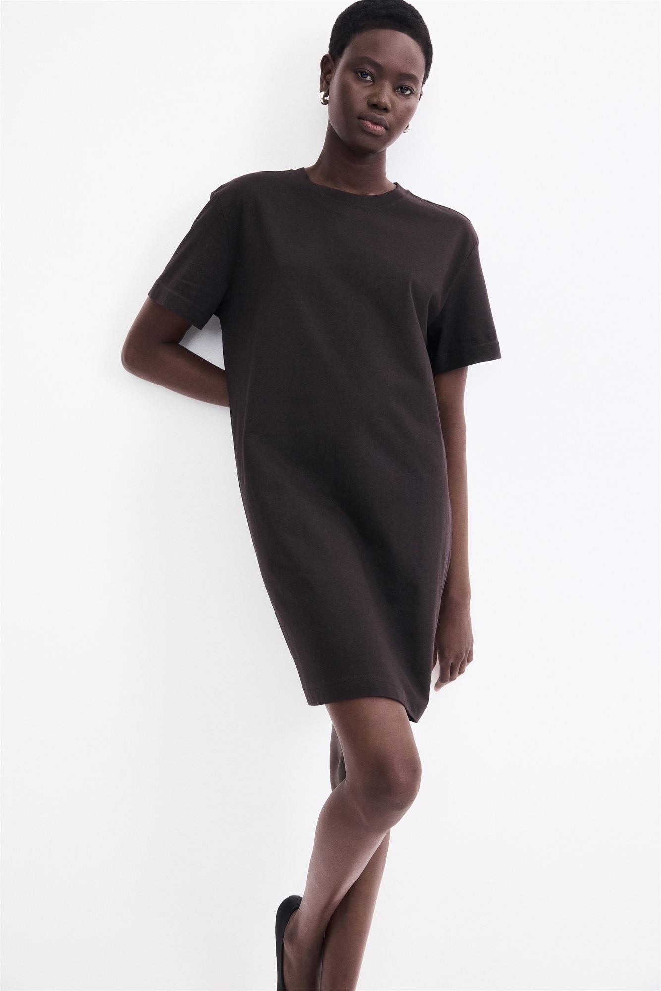 Короткое платье-футболка из хлопкового джерси с горловиной, слегка спущенными плечами и прямым покроем.