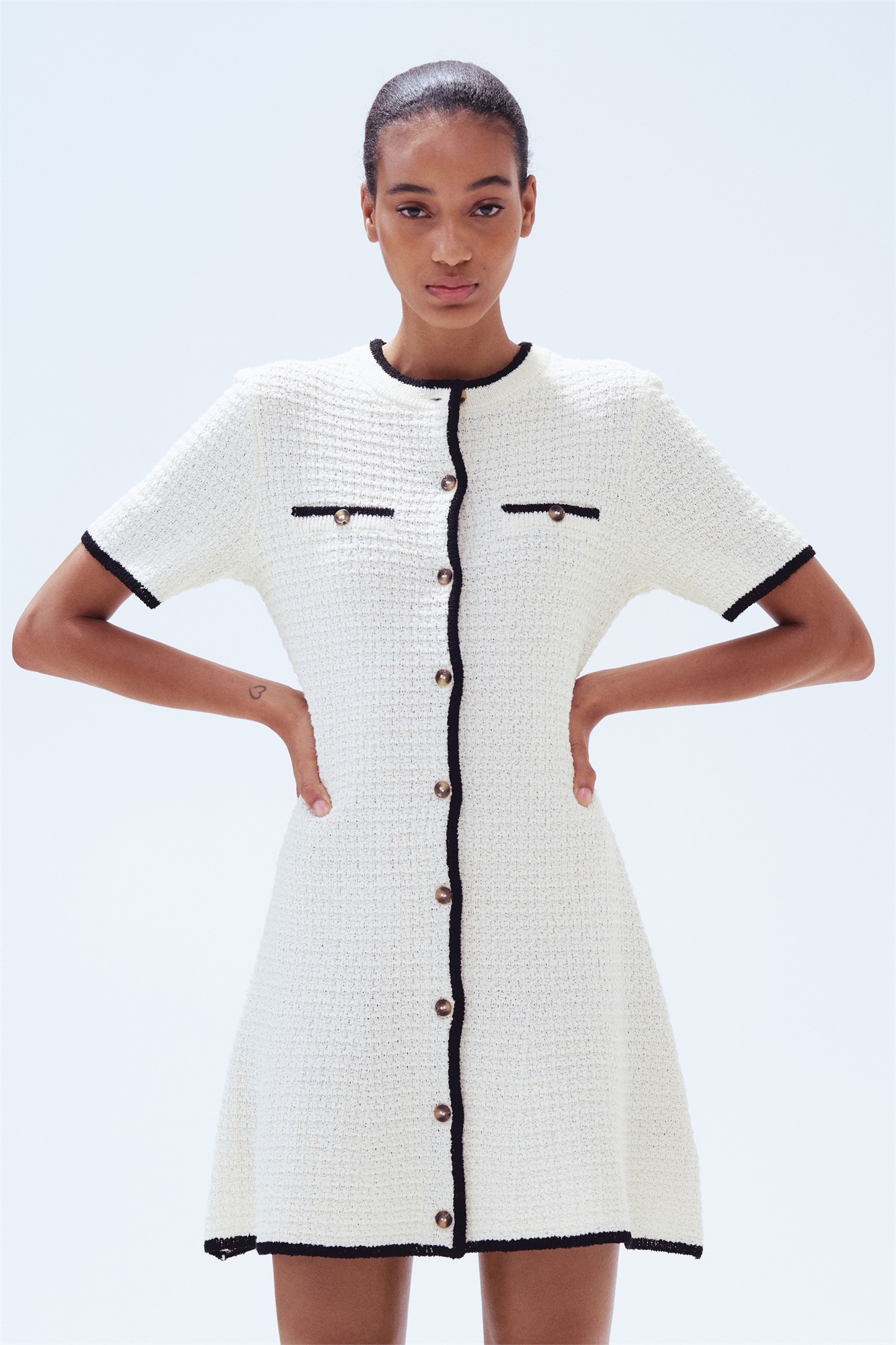 Короткое платье из фактурного трикотажа с кантами контрастного цвета. Круглый вырез, застежка на пуговицы спереди и короткие рукава. Нагрудные карманы с пуговицей и расклешенная юбка.
