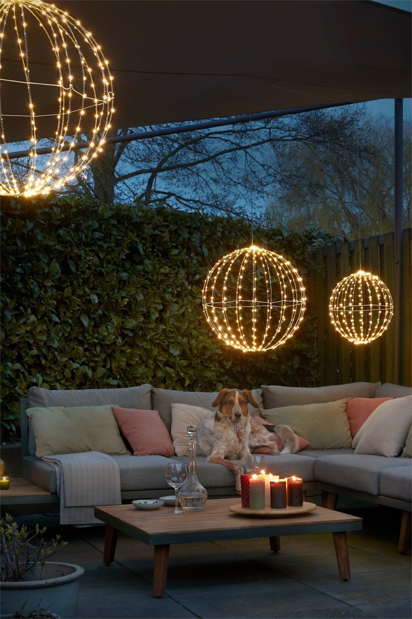 С помощью наружного рождественского освещения от Luca Lighting вы сможете создать праздничную атмосферу и в своем саду. Например, с помощью этой подвесной гирлянды с подсветкой! Каркас изготовлен из прочного металла и отделан серебром. В него вмонтирована нить из 320 светодиодных лампочек, излучающих теплый белый свет. Лампочки можно настроить на автоматическое включение и выключение с помощью таймера. Практично! Поставляемый в комплекте адаптер с 3-метровым соединительным кабелем защищен от брызг. Вы уже выбрали подходящее место для этого декоративного светильника? Диаметр декоративного шара составляет 50 см.