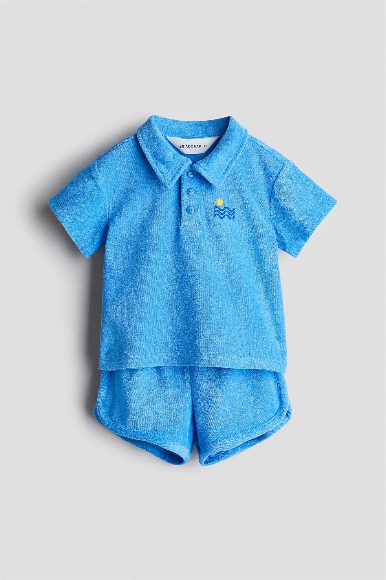 H&M Adorables. Комплект из рубашки-поло и шорт из мягкой махровой ткани. Рубашка-поло с отложным воротником, застежкой на пуговицы и короткими рукавами. Шорты с регулируемой эластичной талией и закругленными краями. Коллекция H&M Adorables - это подборка качественных вещей повышенной комфортности, не теряющих актуальности.