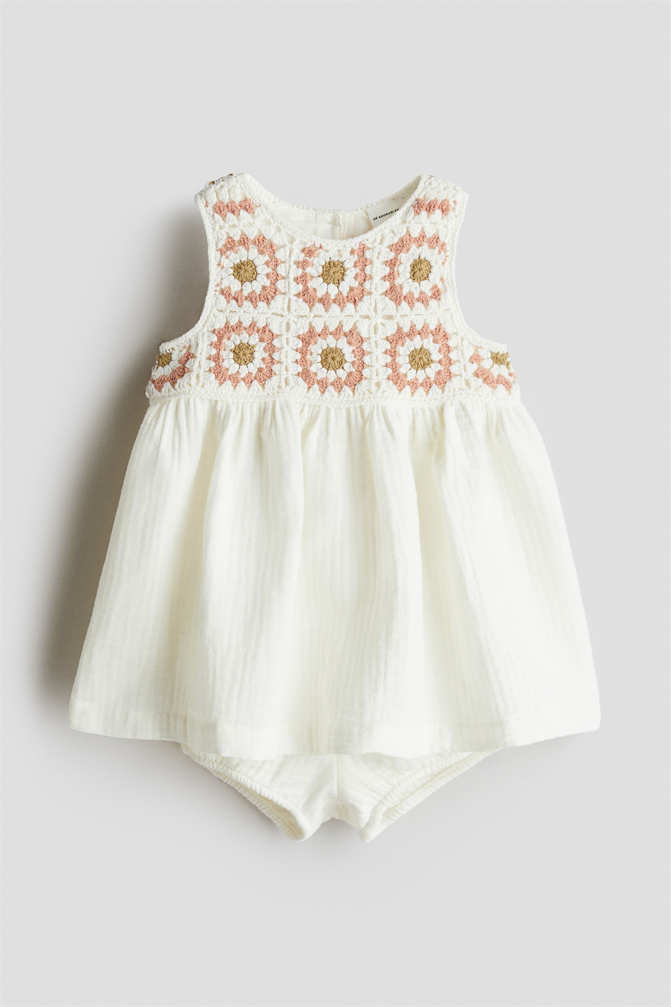 H&M Adorables. Комплект из платья и пары распашонок из мягкого муслина, изготовленного из высококачественного хлопка. Платье с приталенным вязаным лифом с круглым вырезом, застежкой на пуговицы сзади и сборками на талии. Блумеры с мягкой, узкой резинкой на талии и вокруг ног. Коллекция H&M Adorables - это подборка удобных и качественных вещей, не теряющих актуальности.
