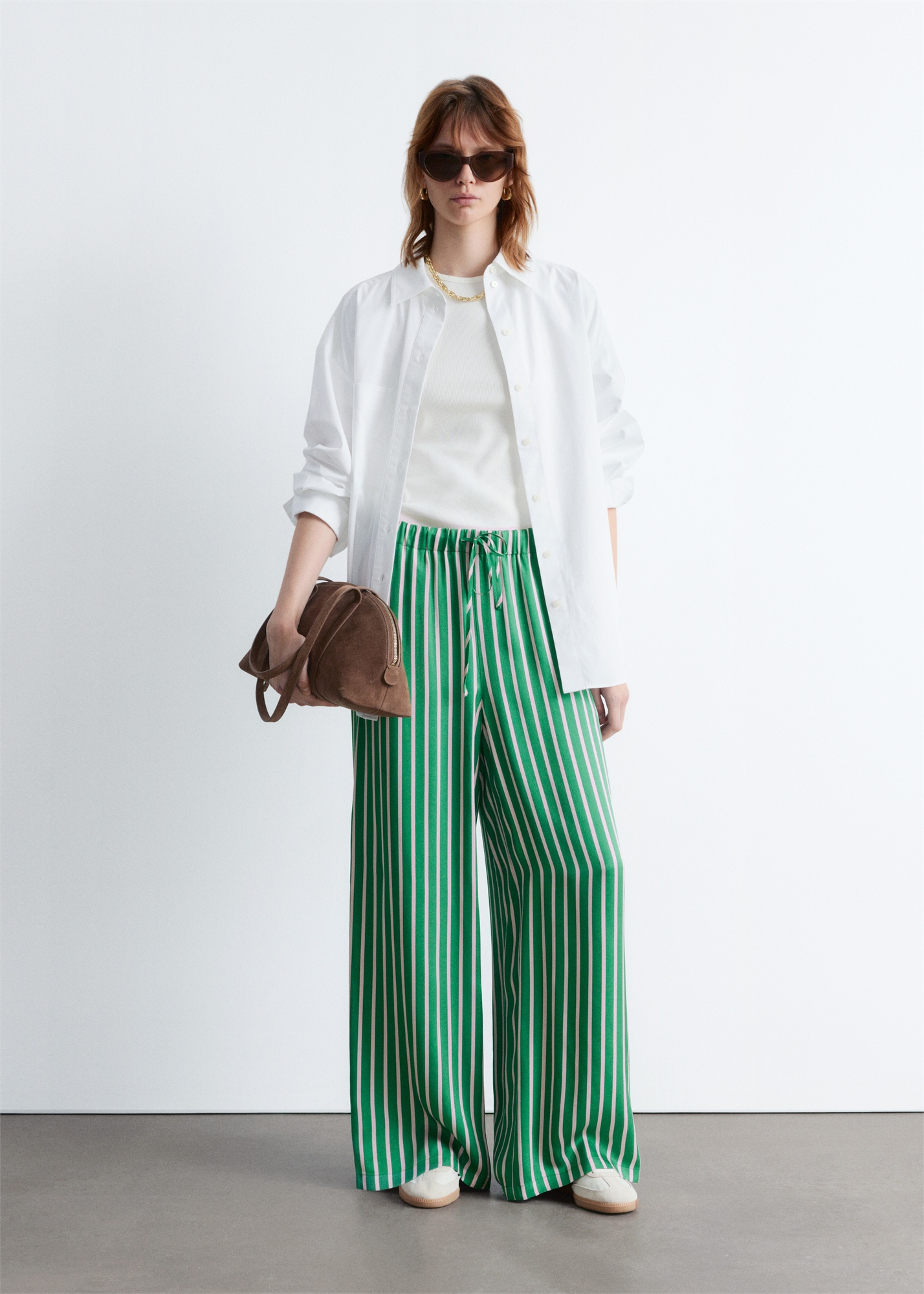Эти брюки сшиты из легкой атласной ткани, мягкой на ощупь. Они выполнены в свободном силуэте и имеют эластичный пояс с тонкими регулируемыми завязками для удобной посадки. Карманы в боковых швах. Длина по линии бедра: 76 см / 29,9 дюйма (EU 36 / UK 8 / US 4)