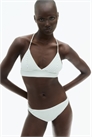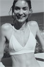 Бикини на подкладке, без проводов, с узкими регулируемыми бретелями, перекрещивающимися сзади. Треугольные чашечки со съемными вкладышами, которые придают форму бюсту и обеспечивают хорошую поддержку. Без застежек.