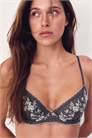 Бюстгальтер из вышитой сетки с регулируемыми бретелями и чашечками с сетчатой подкладкой, которые придают бюсту естественную форму и обеспечивают легкую поддержку. Обрезные края в верхней части и на подоле, застежка на крючки и глазки сзади.