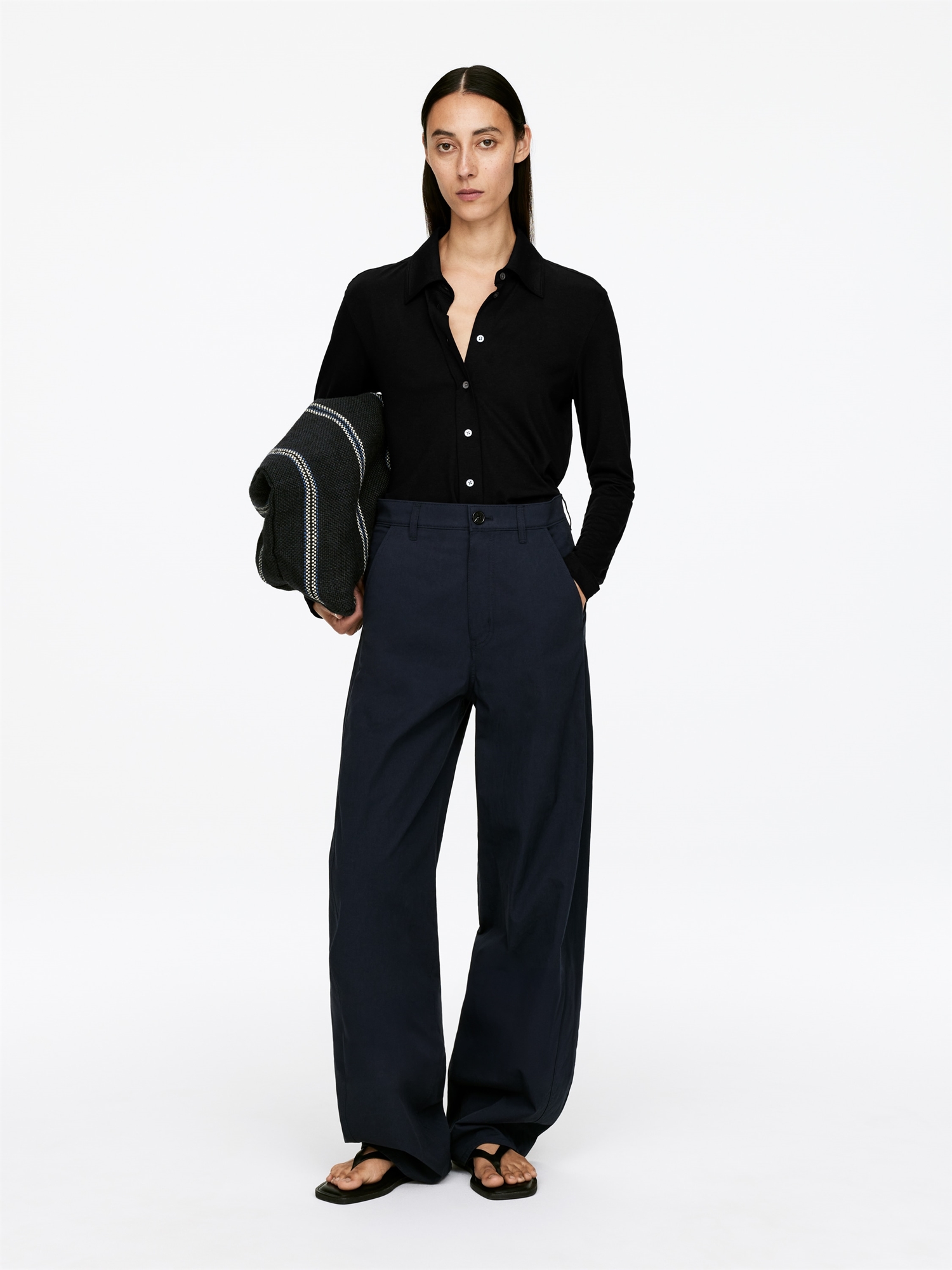 Легкие хлопковые брюки с широкими штанинами Barrel-Leg и средней талией. Косые боковые карманы и накладной карман сзади. Застежка на молнию и пуговицу.