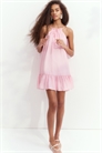 Короткое платье без рукавов из смеси вискозы с воздушным плетением. Узкий круглый вырез со сборками и оборками спереди и сзади, потайная застежка-молния сзади и длинные узкие завязки спереди. Свободный крой со сборкой по подолу для придания дополнительного объема. На подкладке.