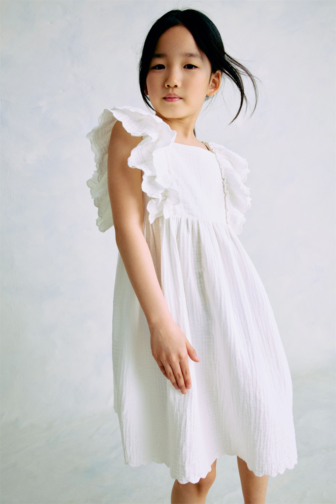 H&M Adorables. Платье без рукавов из высококачественного хлопка мягкого переплетения с отделкой оверлоком и гребешками. Квадратный вырез горловины, узкий вырез горловины с двухслойными оборками, переходящими на плечи, и отверстие с пуговицами сзади. Сборки на талии и расклешенная юбка. Коллекция H&M Adorables - это подборка удобных и качественных вещей, не теряющих актуальности.