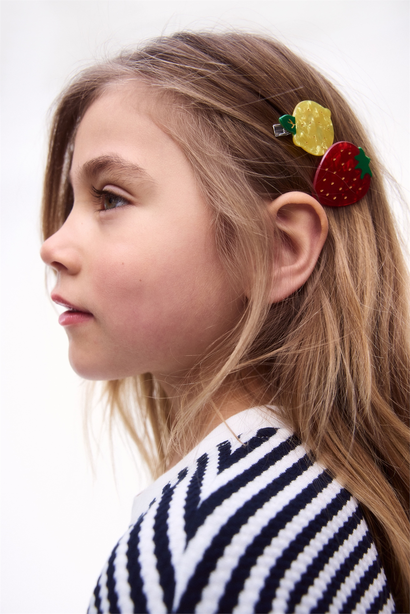 Набор из двух металлических заколок и резинки для волос без зажимов с аппликацией в виде фруктов из мерцающего пластика.