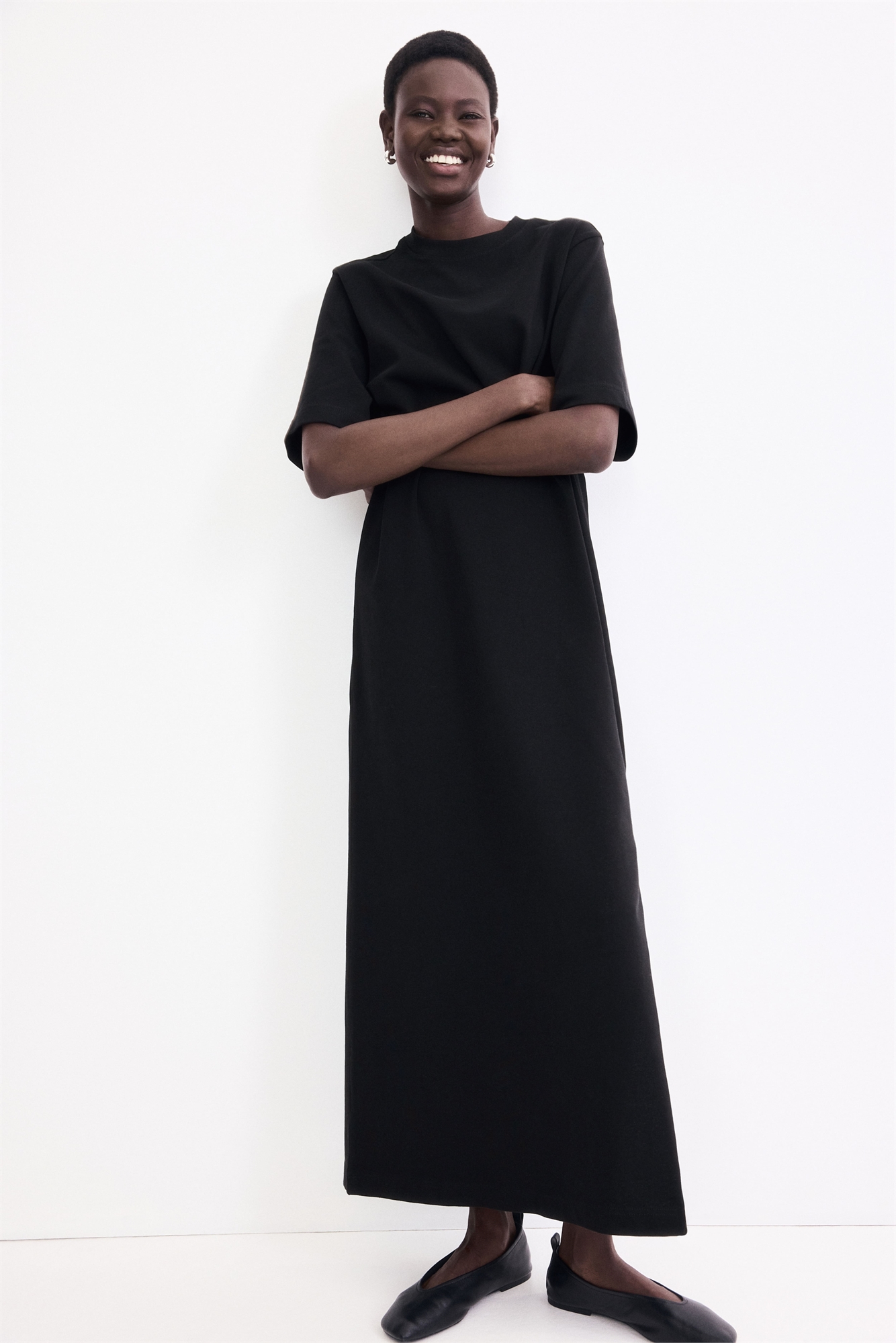 Длинное платье-футболка из плотного хлопкового джерси с горловиной и прямым покроем с высоким разрезом с одной стороны.