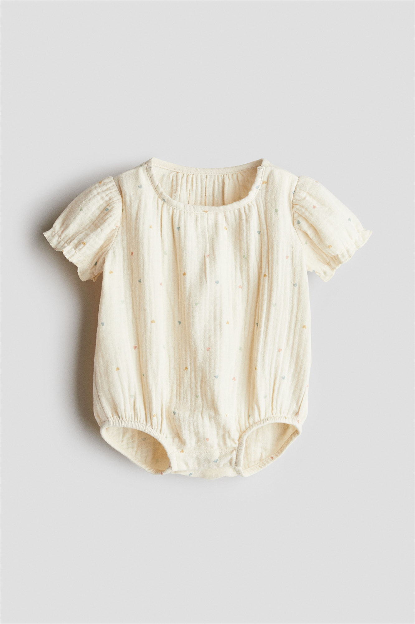 Ромпер из мягкого хлопкового муслина с принтом по всей поверхности. Круглый вырез со складками, короткие рукава с оборчатыми манжетами и узкие, обтянутые резинкой ножки. Скрытые кнопки на плечах и внизу для удобства переодевания.