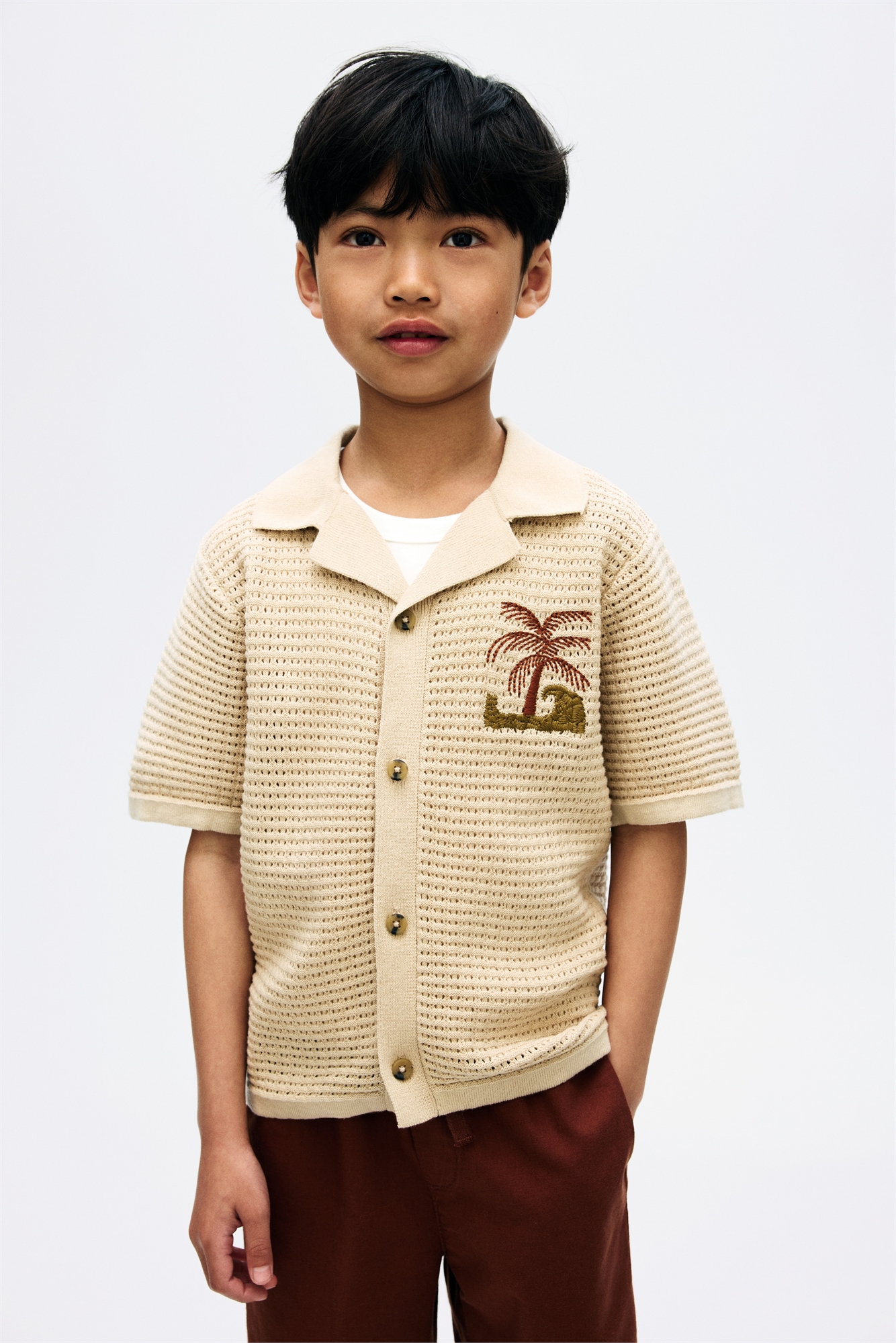 Свободная рубашка из мягкого дырчатого трикотажа из хлопка с вышитым мотивом спереди. Ребристый курортный воротник, пуговицы спереди, окантовка проймы, манжеты и подол.