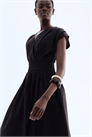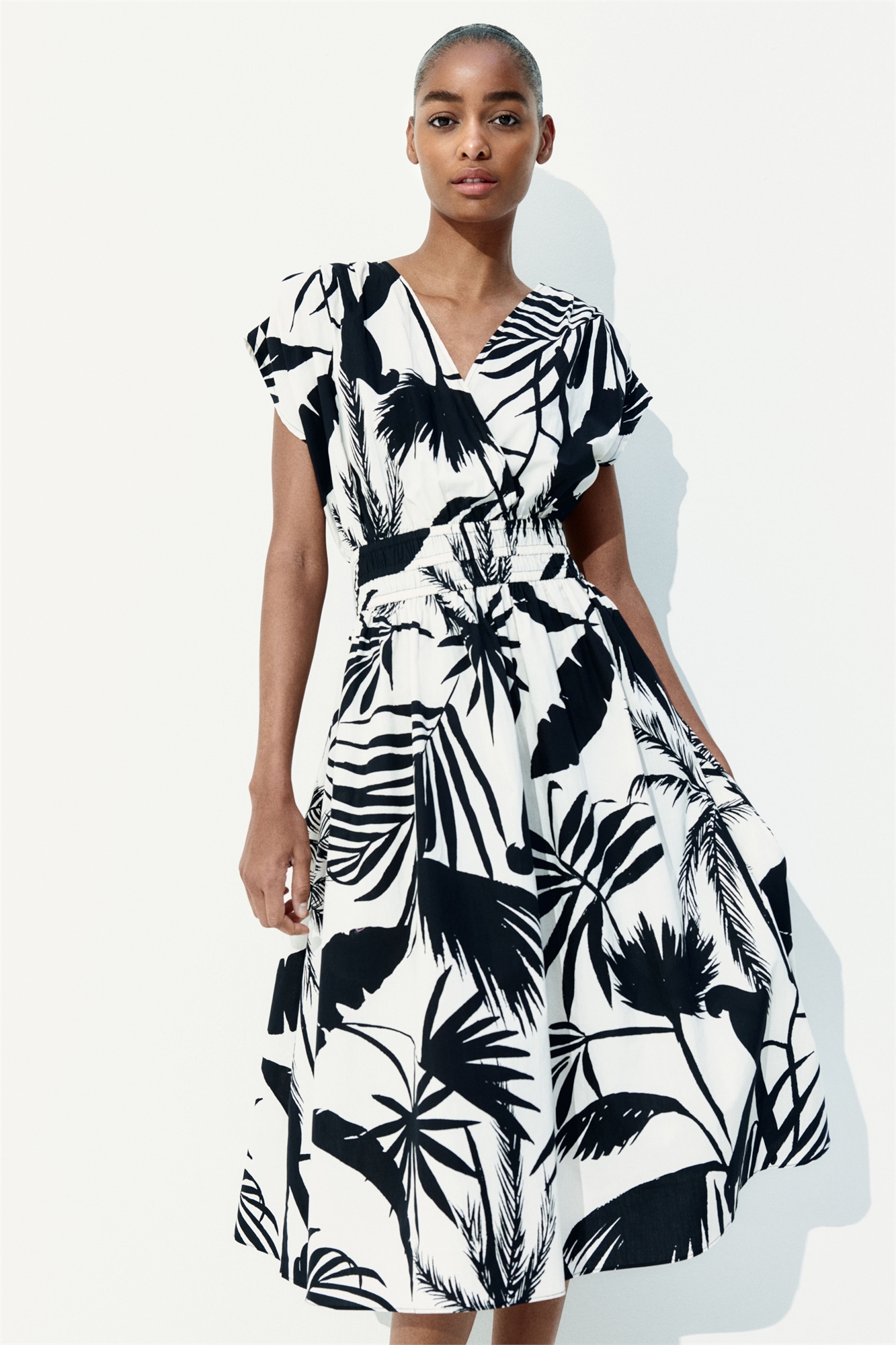 Платье без рукавов длиной до колен из хлопкового полотна с V-образным вырезом, складками на плечах и пришитой обтачкой в верхней части. Эластичные шлевки на талии и расклешенная юбка. Без подкладки.