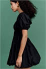 Короткое платье из воздушного хлопкового полотна с глубоким вырезом, отделанным оборками, и короткими рукавами с эластичными манжетами. Два ряда узкой эластичной резинки под бюстом и расклешенная юбка на подкладке с пузырчатым подолом.
