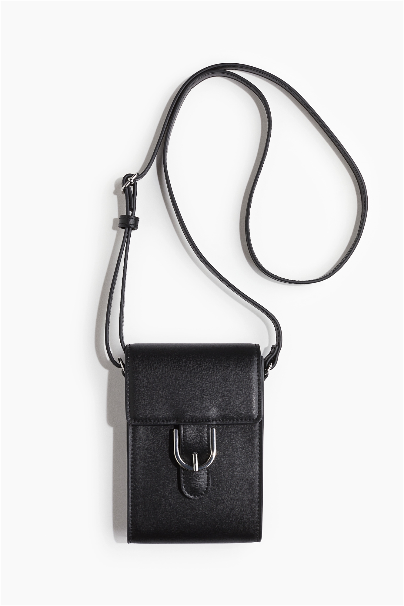 Маленькая сумка-кроссбоди из ткани с покрытием и клапаном с декоративной металлической пряжкой и скрытой кнопкой. Регулируемый плечевой ремень и открытое внутреннее отделение. На подкладке.