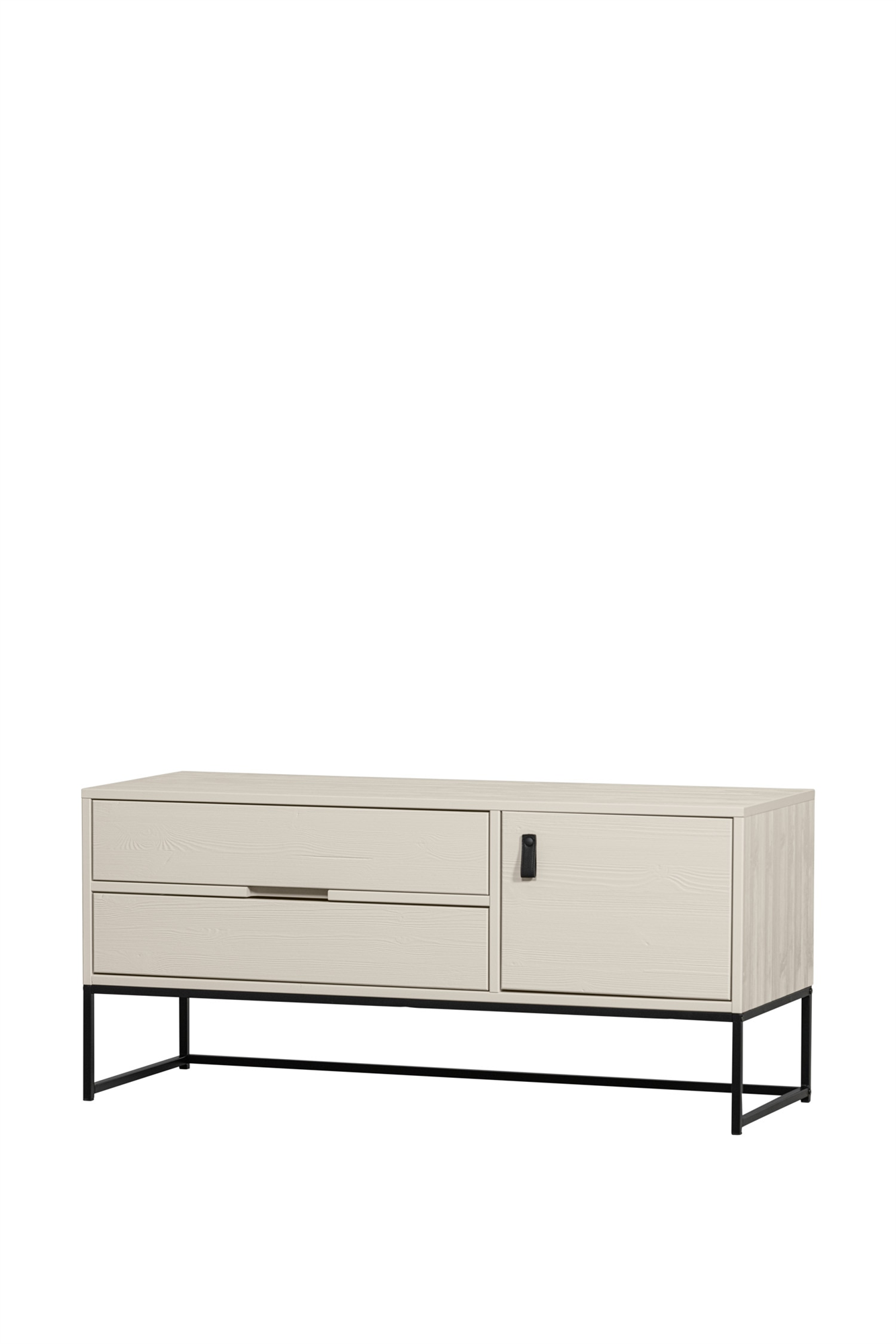 Тумба для телевизора Silas из коллекции Select от WOOOD сочетает в себе современный дизайн и функциональную элегантность. Она изготовлена из сертифицированной FSC древесины сосны, отшлифована и покрыта лаком цвета пыли, и имеет прочное основание из черного металла. Сосновая древесина известна своей гладкой поверхностью, а также характерными зернами, которые придают ей живой вид. Размеры тумбы под телевизор: высота 55 см, ширина 120 см, глубина 44 см. Ящики имеют ширину 61 см и высоту 13 см. С правой стороны находится отделение с полкой и дверцей (высота 37 см, ширина 50,1 см) с кожаной ручкой. Шкаф выдерживает до 60 кг и весит 24 кг.