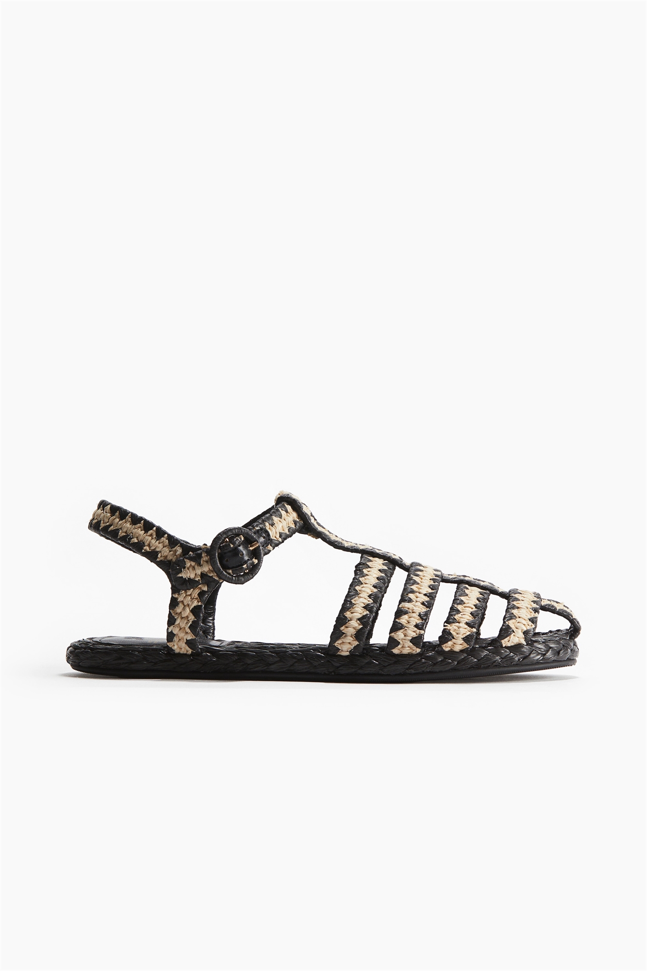 Сандалии-рыбки из плетеной пластиковой соломки с закрытым носком, закругленными пальцами и регулируемым ремешком на щиколотке с круглой пряжкой.