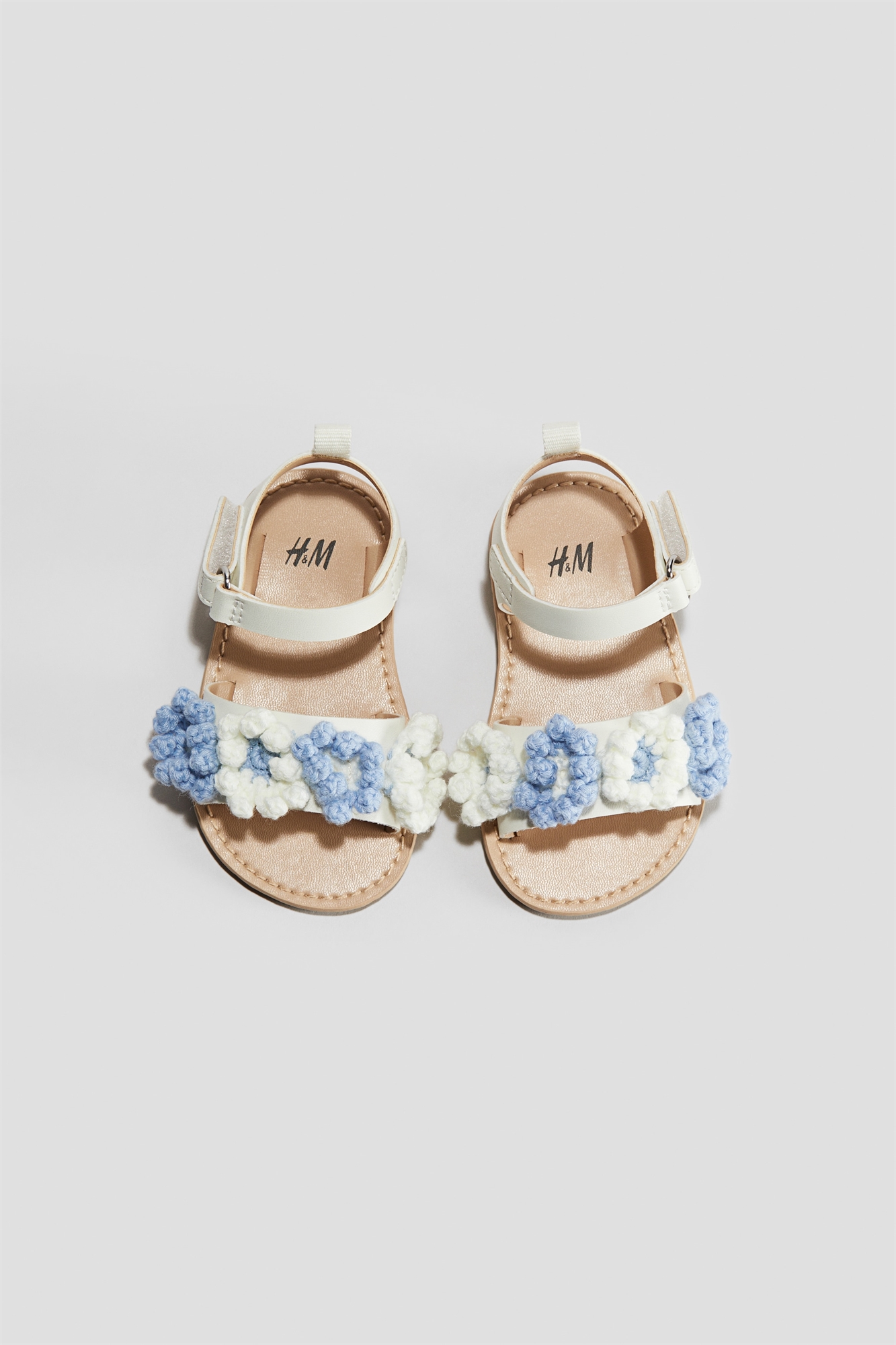 Сандалии с покрытием и ремешком на ноге с аппликацией в виде цветка. Ремешок на щиколотке с застежкой на крючок и петлю, а также петля сзади. Рифленая подошва.