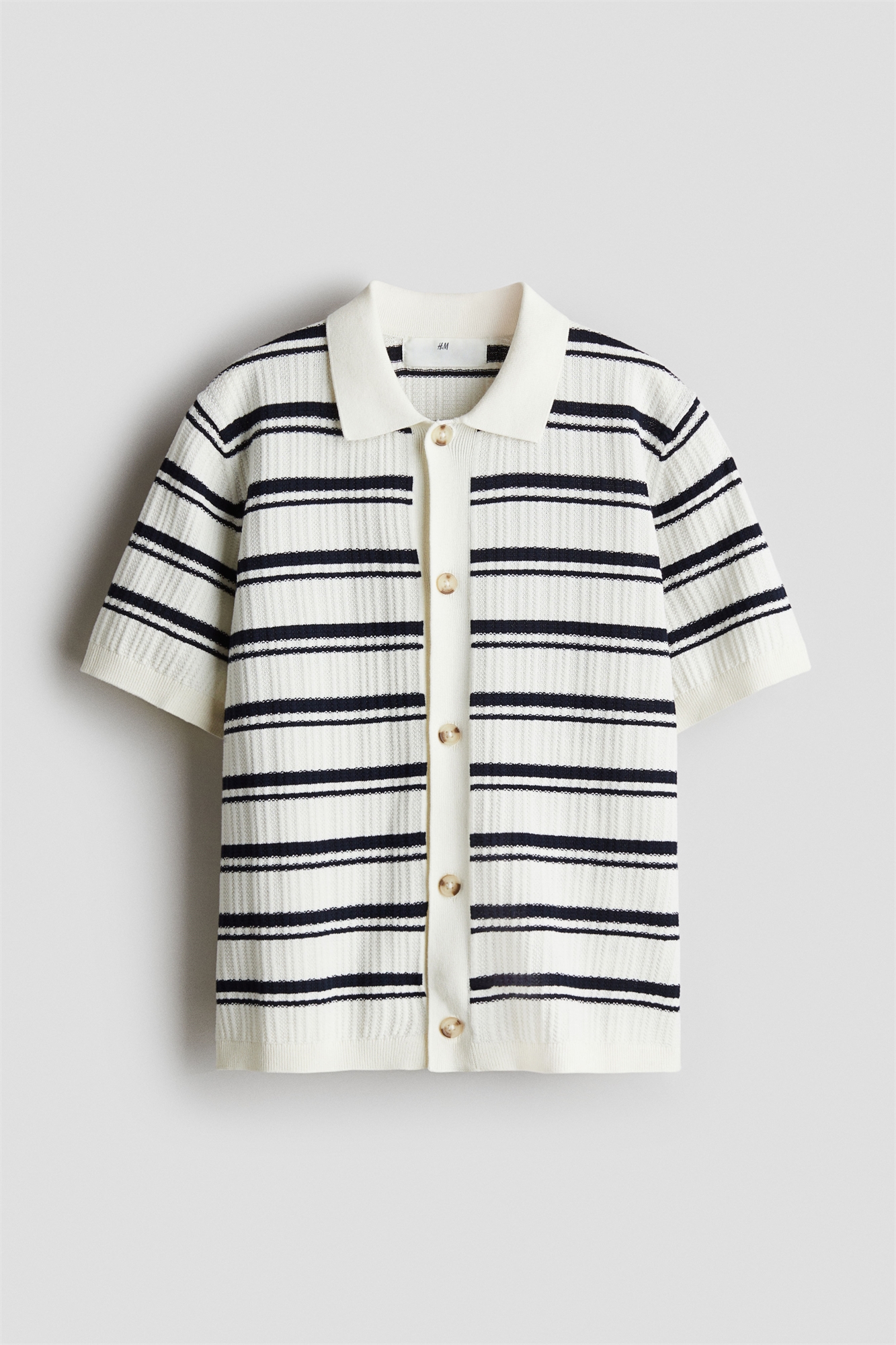 Свободная рубашка из фактурного хлопкового трикотажа с отложным воротником, застежкой на пуговицы спереди и короткими рукавами. Окантовка вокруг проймы, а также на манжетах и подоле.