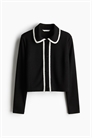 Кардиган из плотного трикотажа с воротником и закрытыми пуговицами спереди. Отделка букли акцентного цвета вокруг воротника и по краю пуговиц.