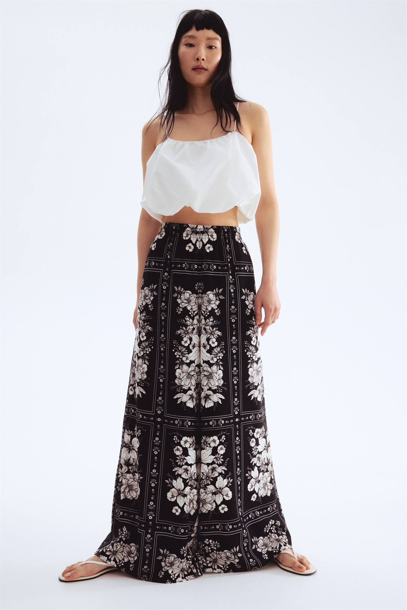 Свободные брюки из тканого материала с высокой эластичной талией, неброскими боковыми карманами и широкими штанинами.