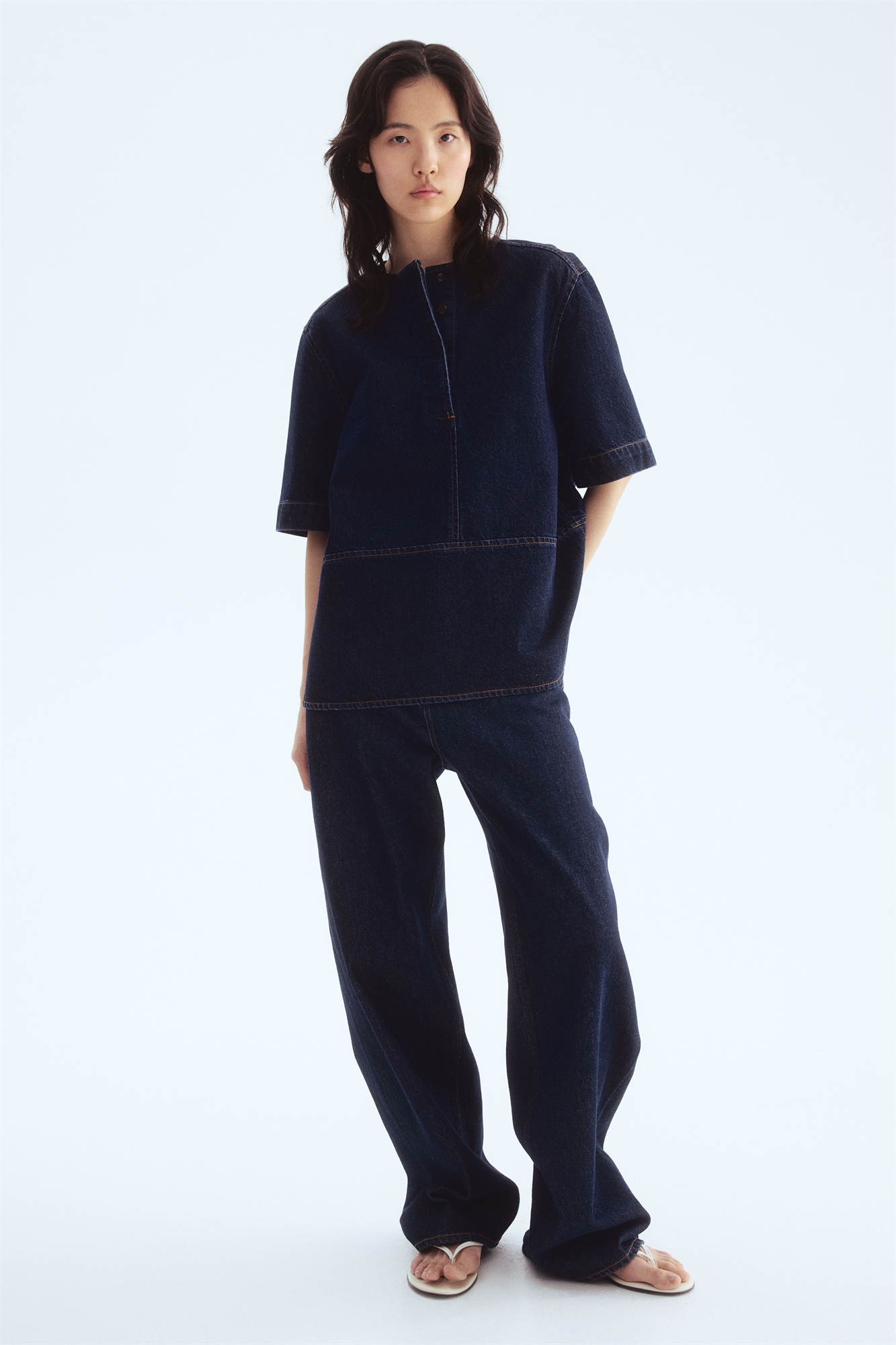 Топ оверсайз из хлопкового денима с видимыми швами спереди и сзади. Круглый вырез и потайная застежка на пуговицах. Рукава длиной до локтя и подол прямого кроя с загнутыми боковыми вентиляционными отверстиями.