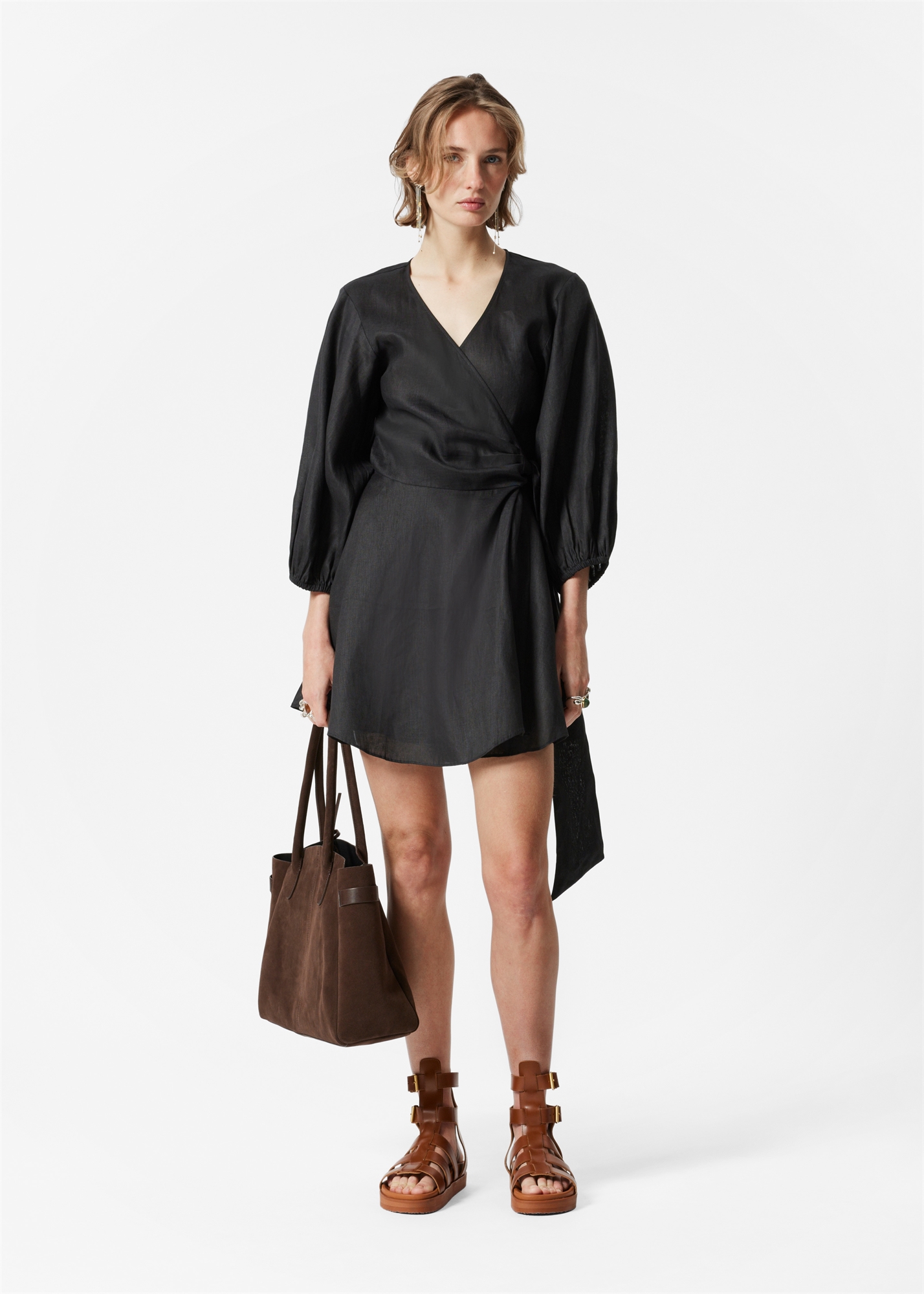 Это мини-платье, созданное из легкого, дышащего льна, - воплощение теплой погоды. Оно имеет V-образный вырез и объемные рукава длиной три четверти с эластичными манжетами. Обтягивающая талия аккуратно завязывается сбоку, создавая приталенный силуэт, который переходит в юбку А-линии. Длина платья: 87 см / 34,2" (размер S)