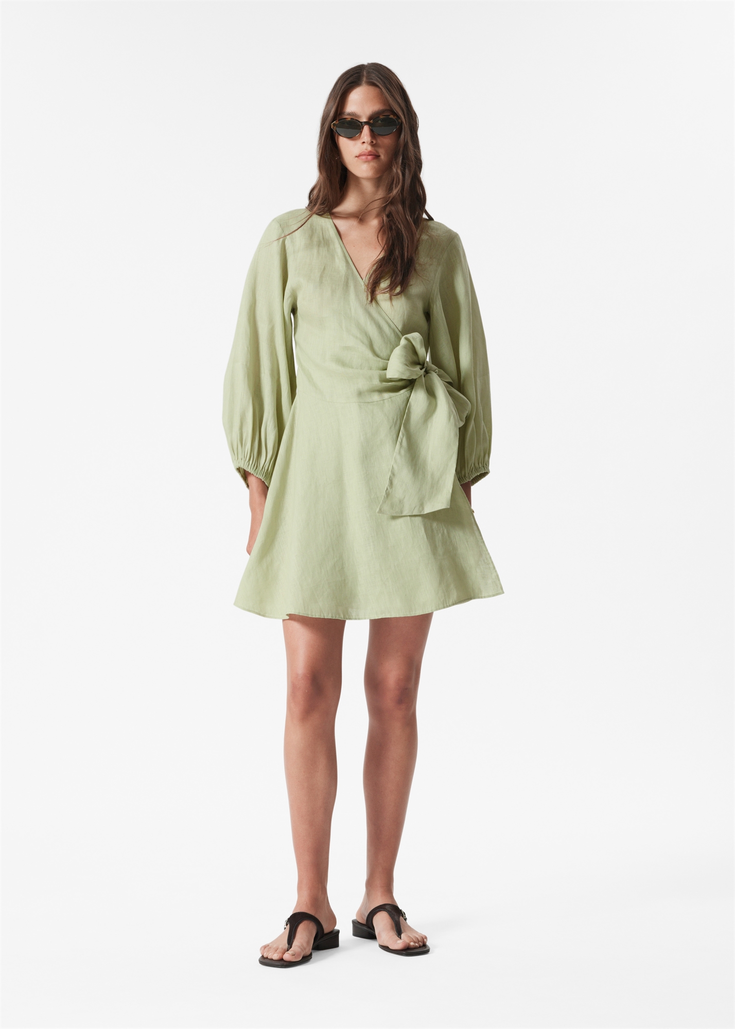 Это мини-платье, созданное из легкого, дышащего льна, - воплощение теплой погоды. Оно имеет V-образный вырез и объемные рукава длиной три четверти с эластичными манжетами. Обтягивающая талия аккуратно завязывается сбоку, создавая приталенный силуэт, который переходит в юбку А-линии. Длина платья: 87 см / 34,2" (размер S)
