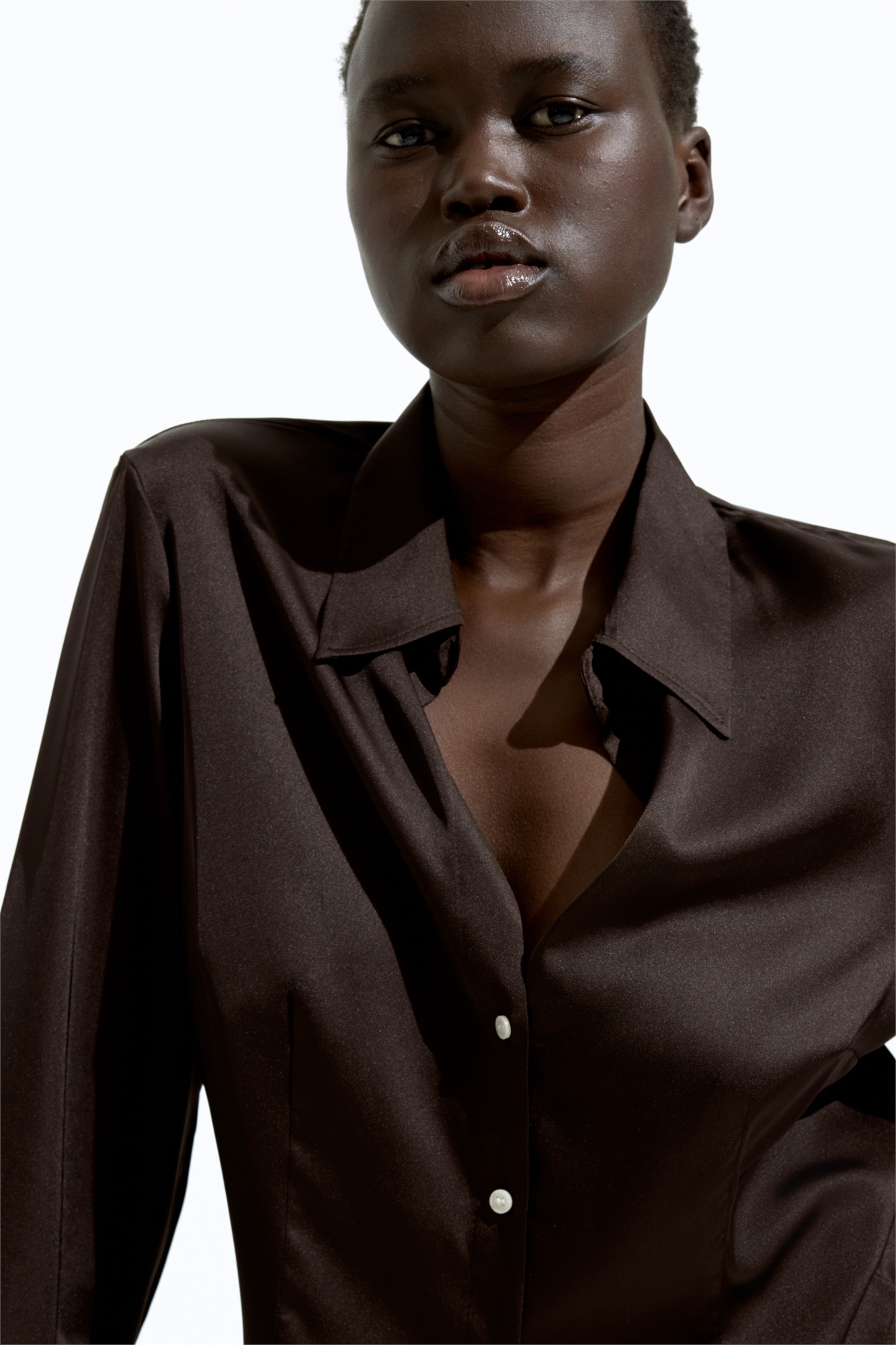 Приталенная рубашка из атласа-стрейч с открытым воротником и пуговицами спереди. Формирующие вытачки спереди и сзади и длинные рукава с разрезом и пуговицей на манжетах.