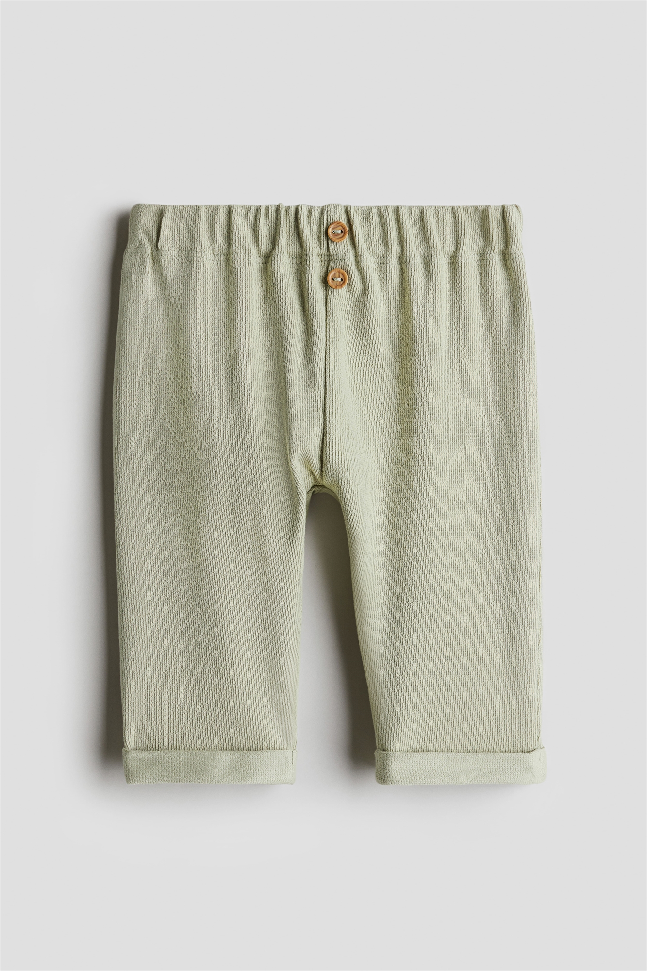 Брюки из мягкого трикотажа с декоративными пуговицами спереди. Регулируемая эластичная талия и вшитые оборочки на подоле.