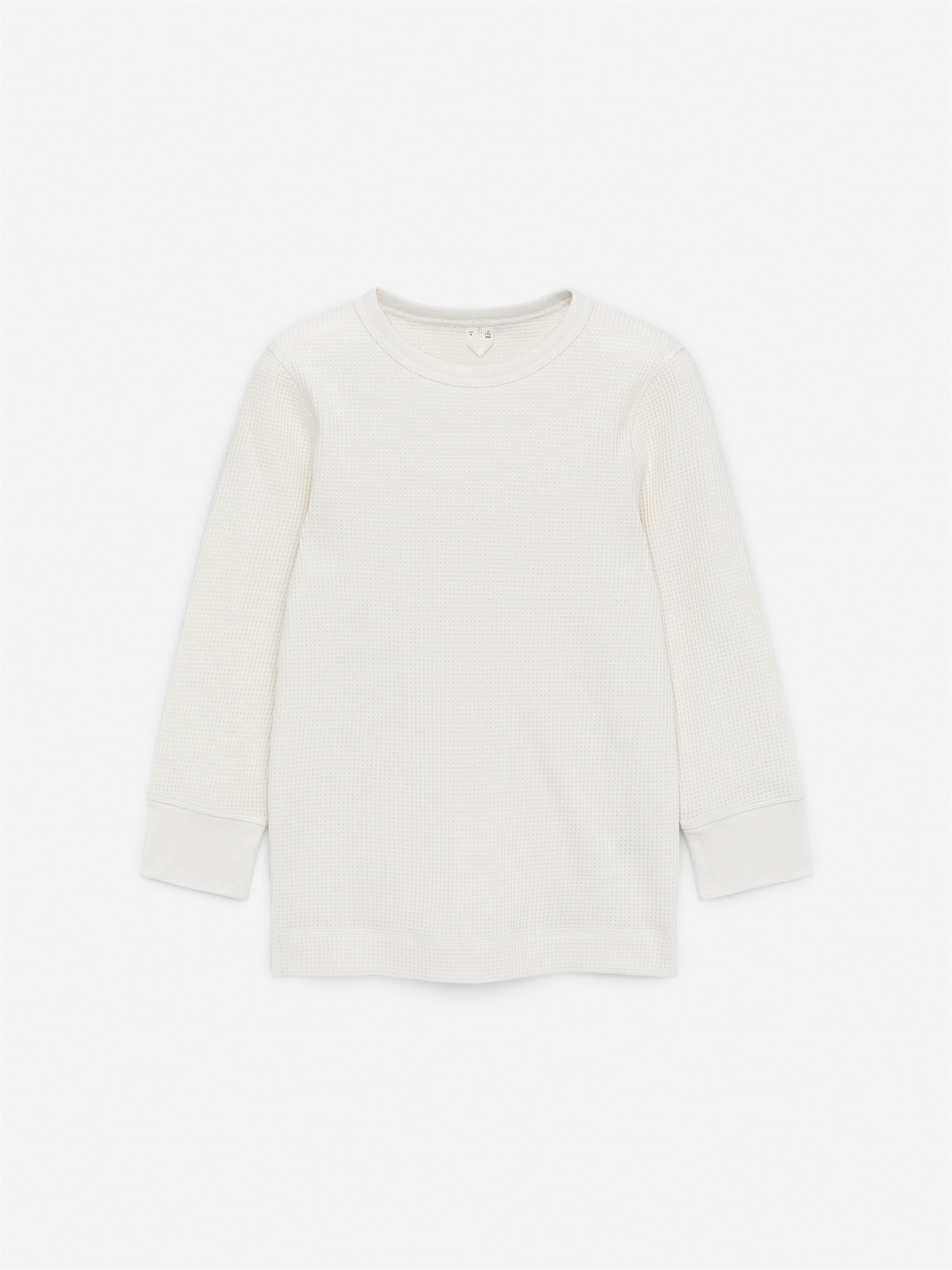 Облегающий топ из хлопкового джерси с вафельной текстурой. Модель с круглым вырезом, рукавами 3/4 и широкими манжетами из трикотажа в рубчик. Короткие разрезы по боковым швам.