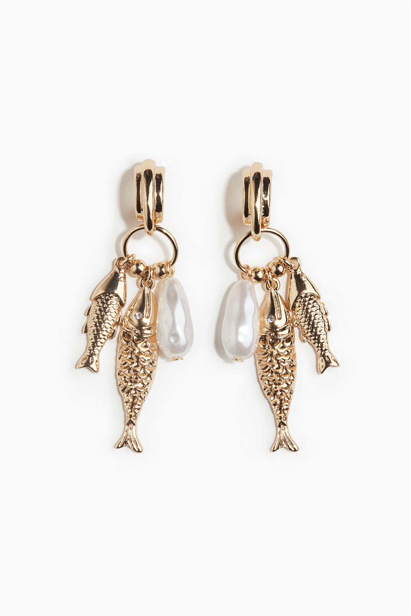 Серьги-обручи, украшенные свисающими перламутровыми пластиковыми бусинами и подвесками в форме рыбок разной длины и дизайна.
