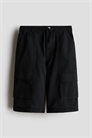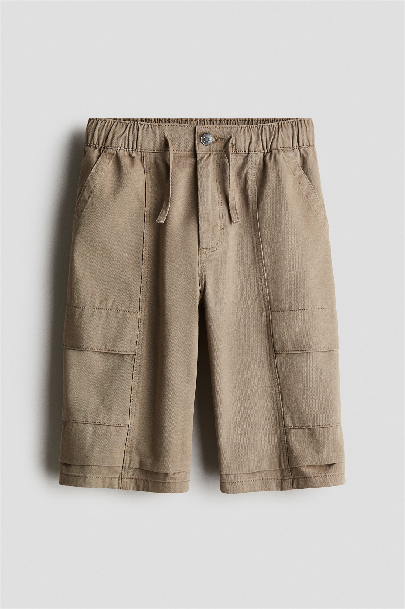 Свободные шорты-карго длиной до колена из мягкой хлопковой саржи с эластичным утягивающим поясом и ширинкой на молнии с пуговицей. Диагональные боковые карманы, карманы на ногах с клапанами и открытые задние карманы. Складки на подоле для придания дополнительного объема.