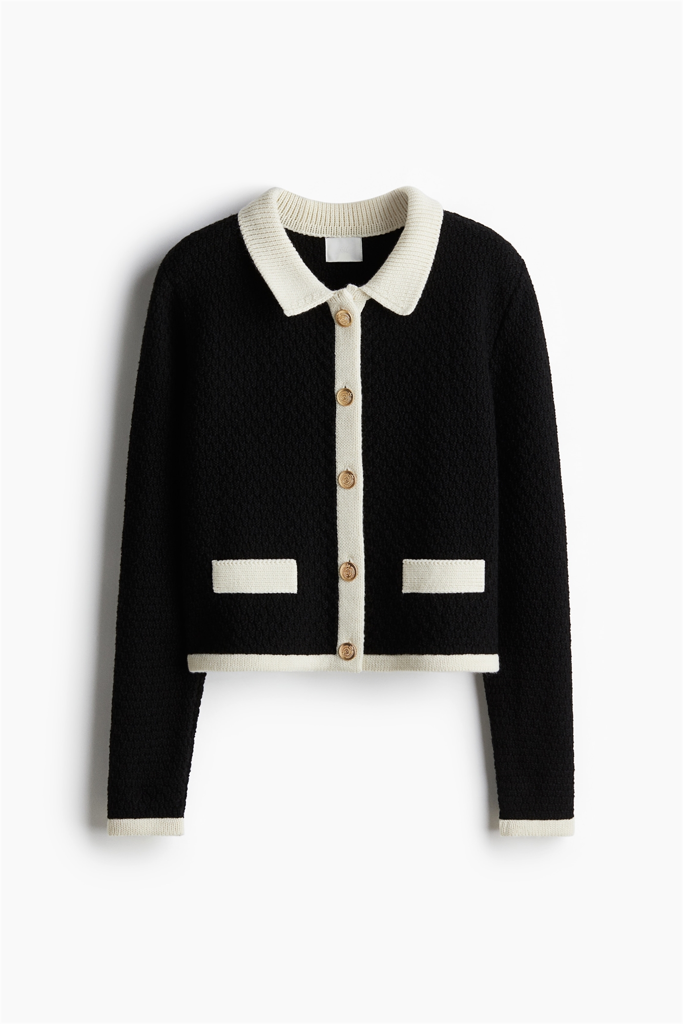 Короткий кардиган из фактурного трикотажа с ребристыми деталями контрастного цвета. Воротник, пуговицы спереди, втачные передние карманы и длинные рукава.