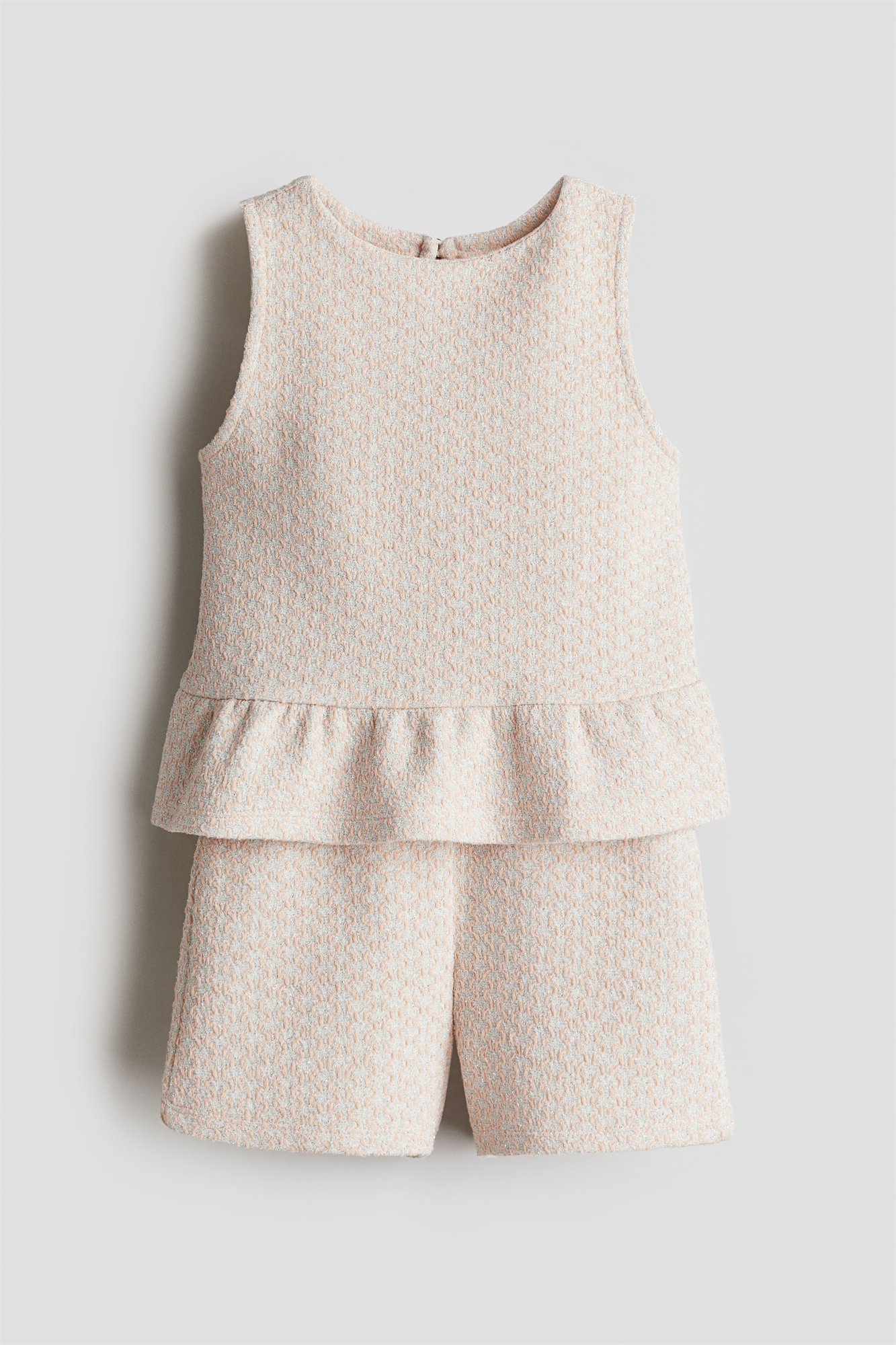 Комплект из топа и шорт из мягкого жаккардового джерси. Топ без рукавов с круглым вырезом, отверстием для ключа с пуговицей на спине и оборкой по подолу. Шорты с эластичной талией.