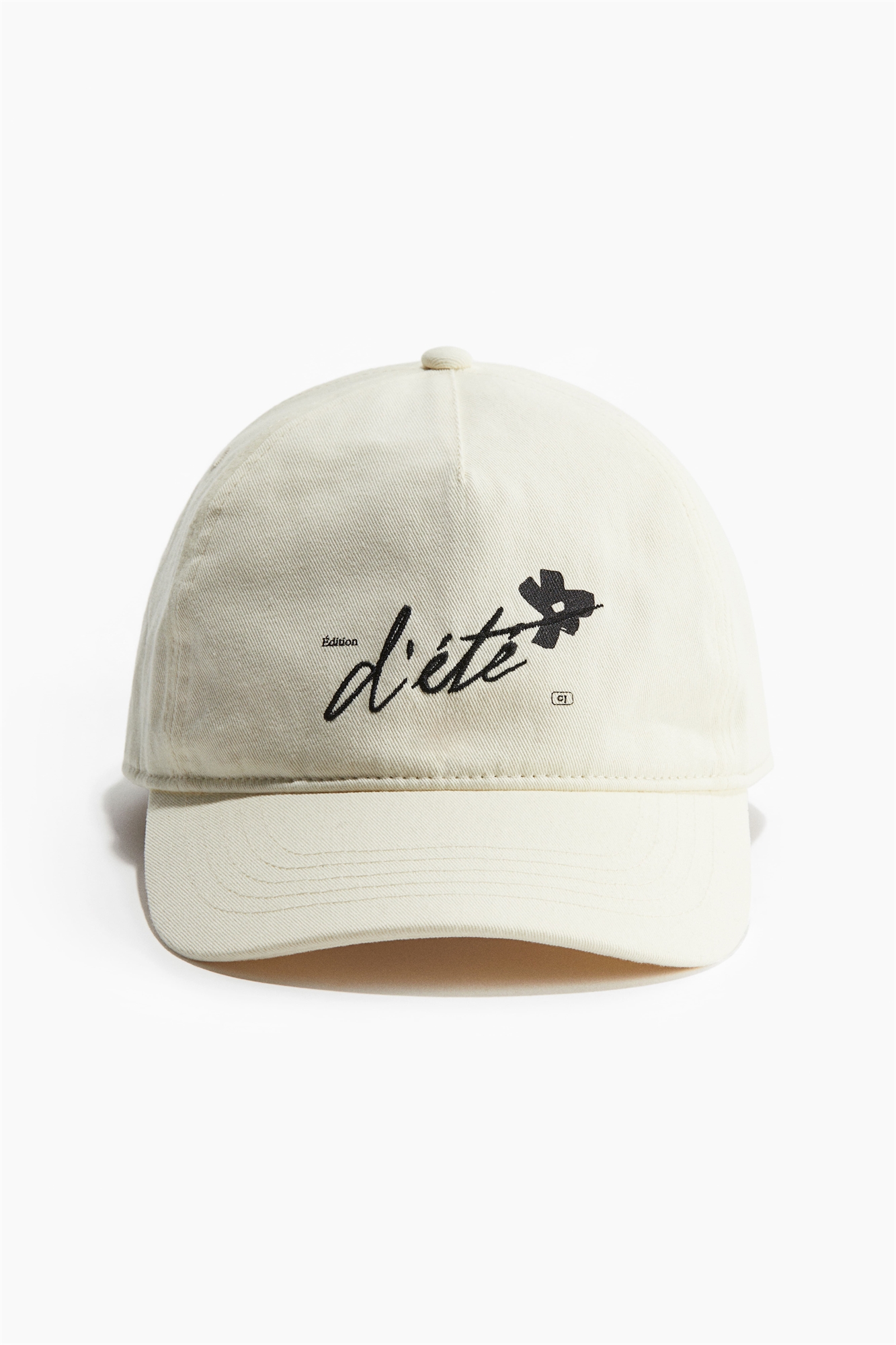 Кепка из хлопковой саржи с вышитым мотивом спереди, вышитыми люверсами сверху и завязкой с регулируемой металлической застежкой сзади. Хлопковый потник.